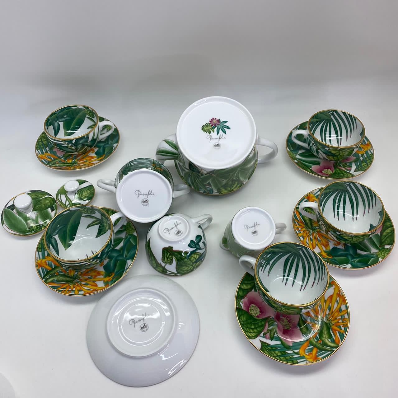 Чайный сервиз Hermes LUX-39601 представляет собой изысканный набор, выполненный в стиле, вдохновленном тропической природой. Яркий цветочный и листовой принт, украшенный золотистой окантовкой, придает ему роскошный вид. Сервиз прекрасно подойдет для создания особой атмосферы во время чаепитий или в качестве элегантного элемента декора.