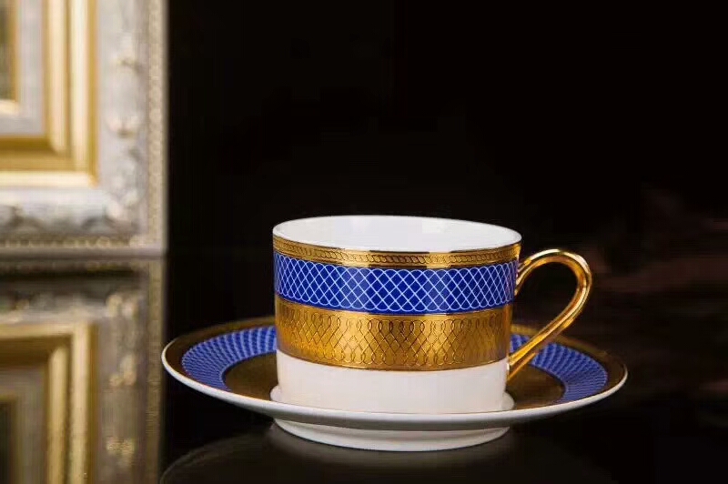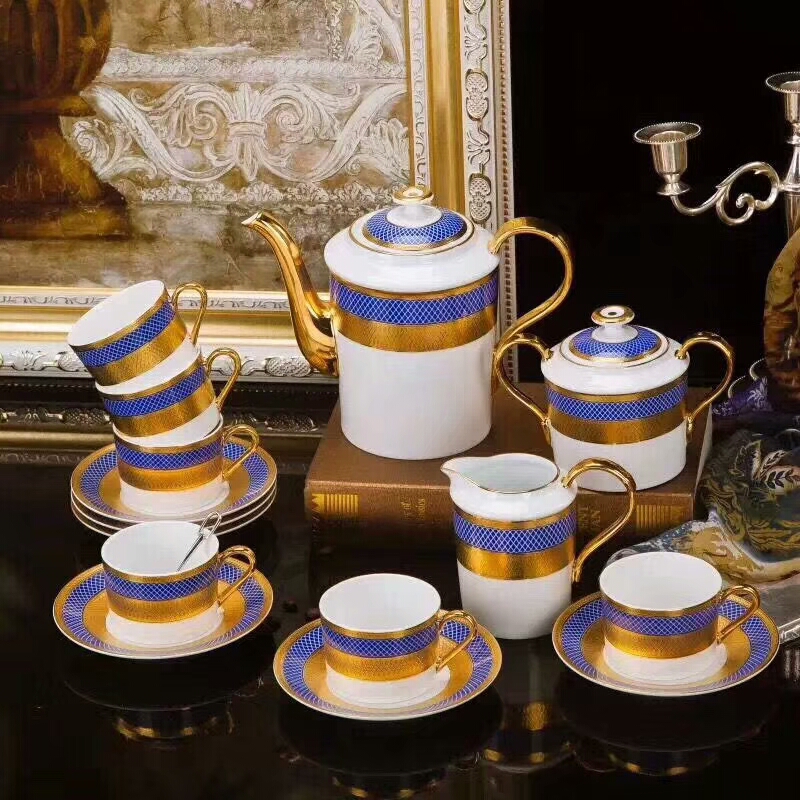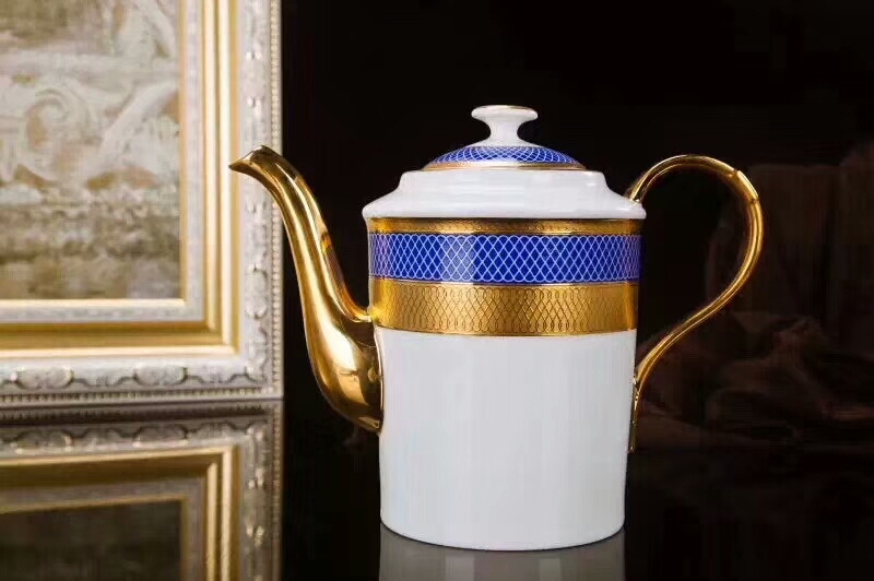 Изысканный чайный сервиз Hermes LUX-22132, выполненный в классическом стиле, станет украшением любого стола. Белоснежный фарфор дополнен элегантным узором из золотых полос и синей сетки, придавая изделию роскошный вид. Этот сервиз идеально подходит для особых случаев и станет прекрасным подарком.