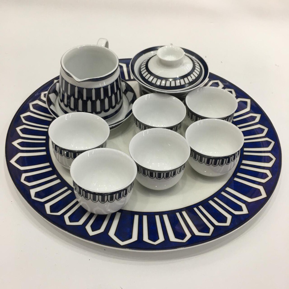 Чайный сервиз Hermes ПО-021 представляет собой изысканный набор посуды, выполненный в классическом стиле с узнаваемым дизайном бренда. Набор включает в себя чашки, молочник, сахарницу и поднос, оформленные в элегантной черно-белой гамме с синими акцентами.