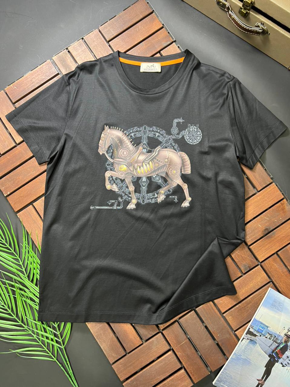 Футболка Hermes LUX-73119 — это воплощение элегантности и стиля. Футболка черного цвета с оригинальным принтом в виде механической лошади, она идеально подходит для создания модных образов. Футболка имеет короткий рукав и круглый вырез горловины.
