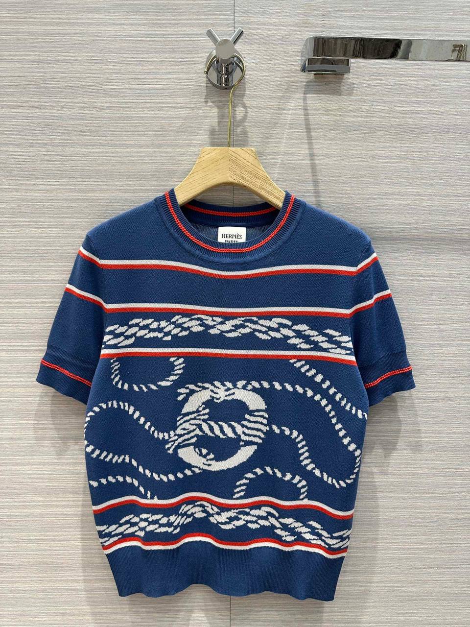Футболка Hermes LUX-86751 — это элегантный предмет гардероба от известного бренда. Изделие выполнено в морском стиле, сочетая синий, белый и красный цвета. Футболка имеет короткие рукава и круглый вырез, ее можно использовать для повседневных образов.