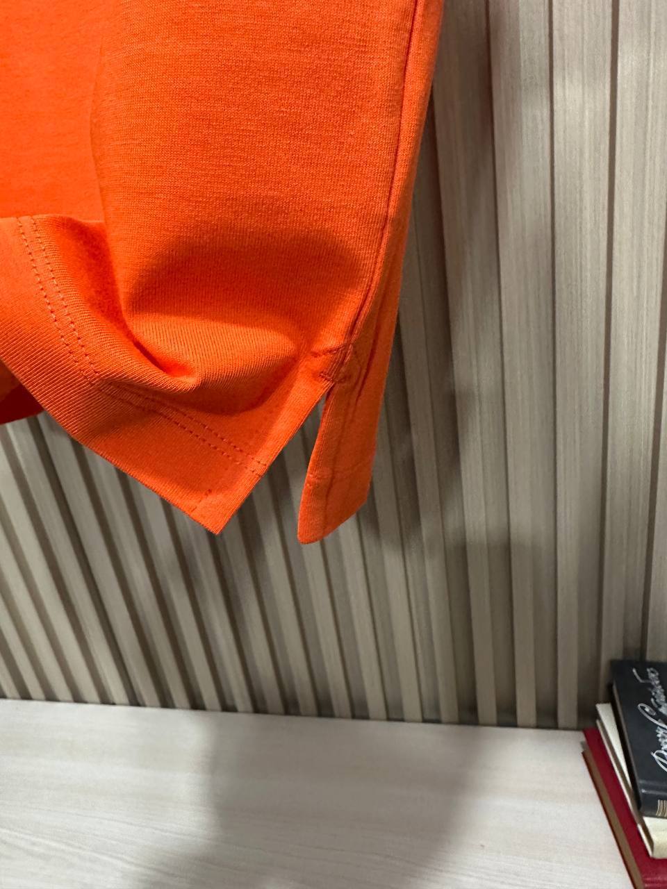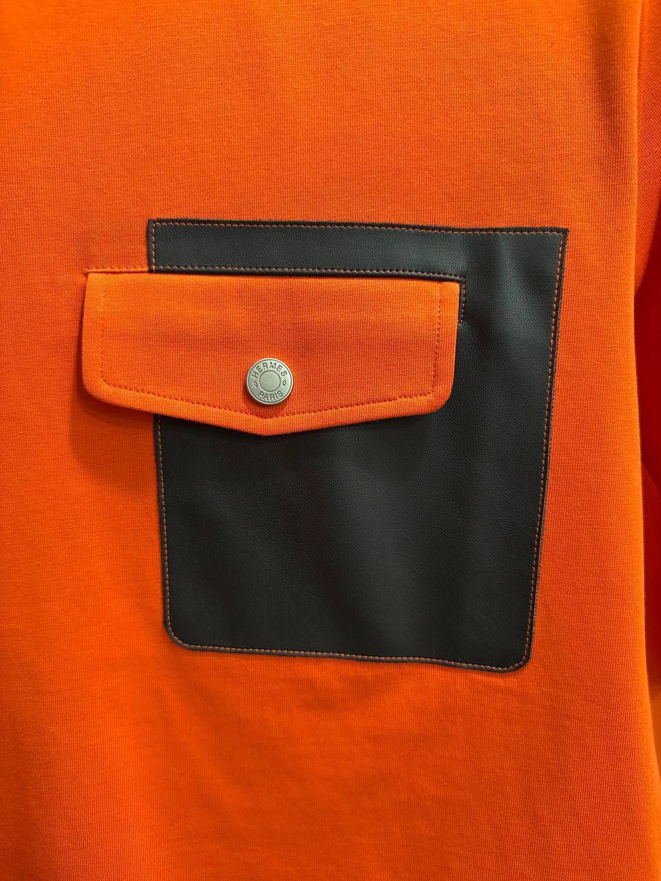 Футболка Hermes LUX-114766 представляет собой стильный предмет гардероба от известного бренда. Футболка выполнена в ярком оранжевом цвете с контрастным черным карманом, что придает ей современный вид. Идеально подходит для создания как повседневных, так и более элегантных образов.