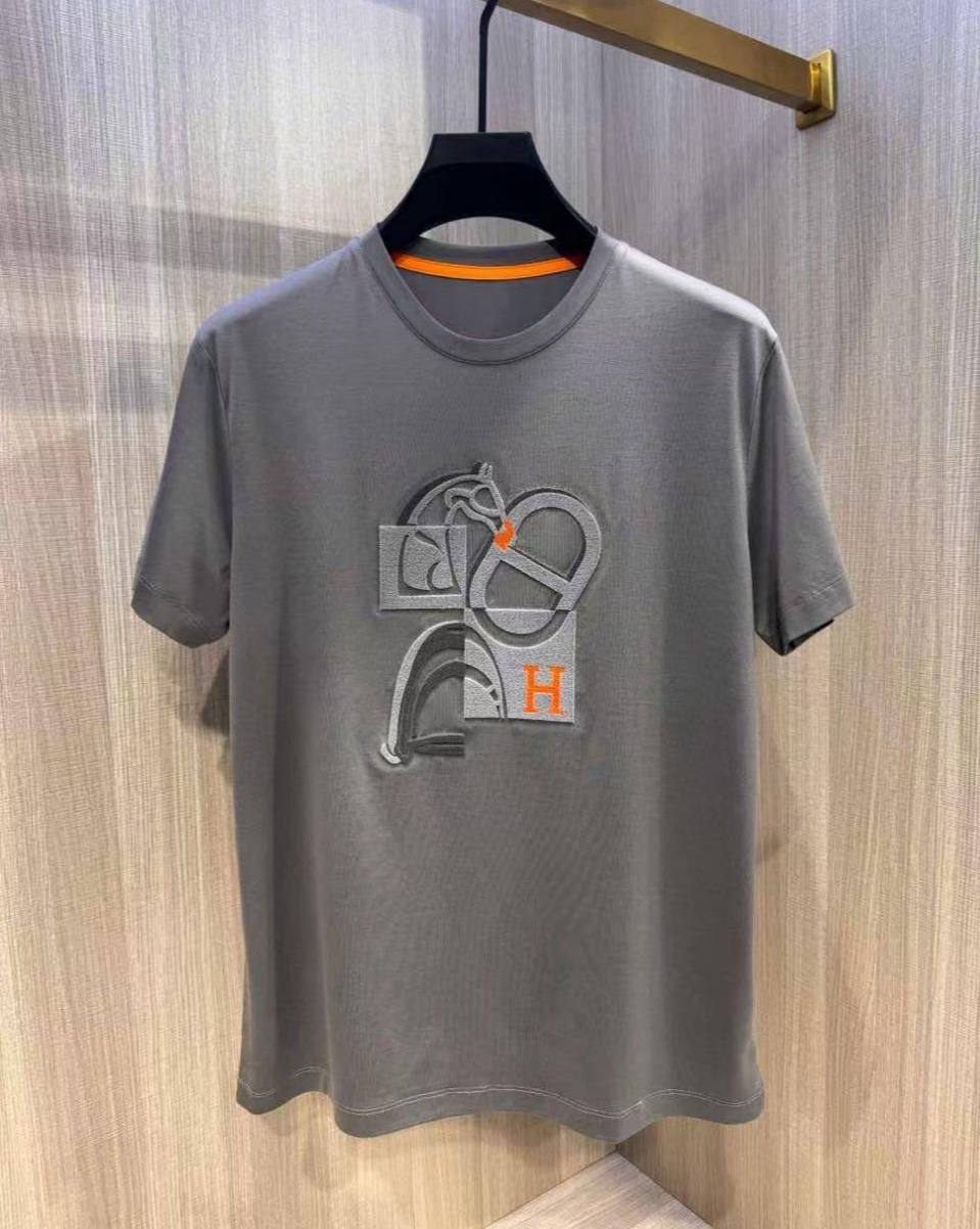 Футболка Hermes LUX-115058 выполнена в классическом стиле и имеет круглый вырез горловины. Цвет футболки — серый, с декоративным элементом в виде логотипа спереди. Эта футболка идеально подойдет для повседневного гардероба.
