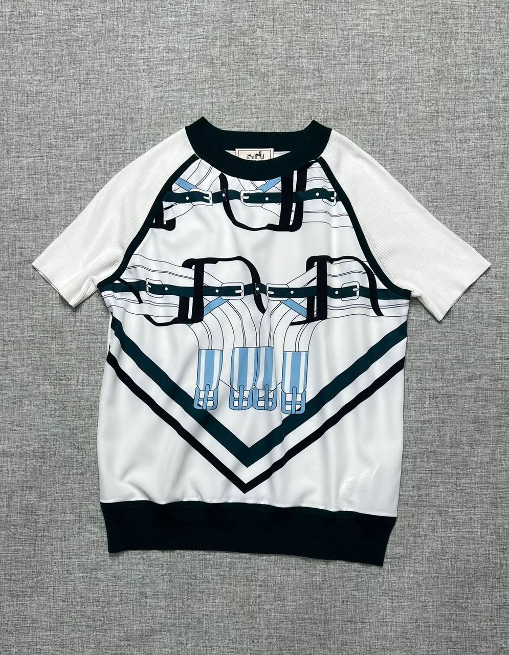Футболка Hermes LUX-115145 – это стильный предмет гардероба от известного бренда. Основной цвет футболки — белый, дополненный принтом и деталями в черном и голубом цветах. Футболка имеет короткие рукава и круглой вырез горловины.