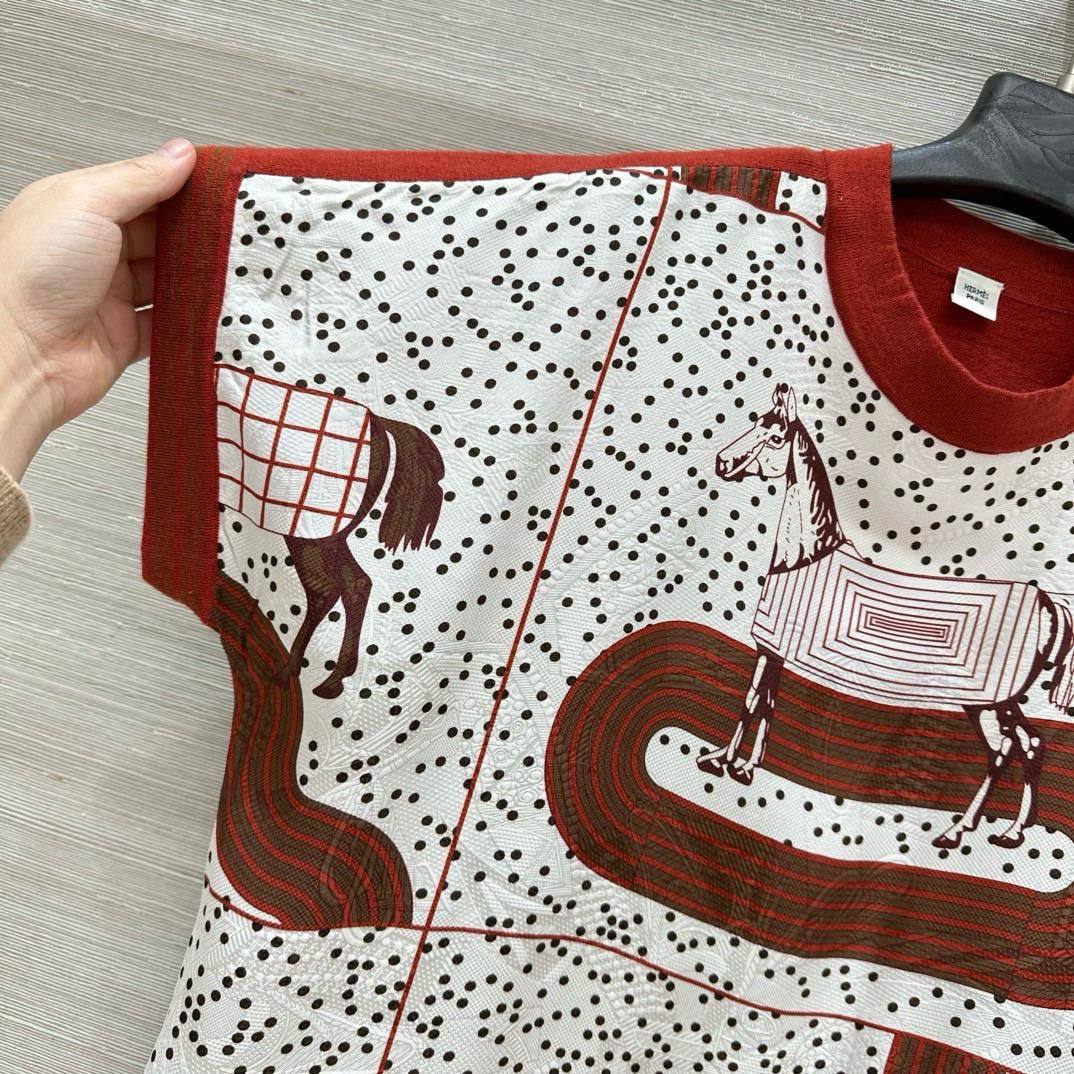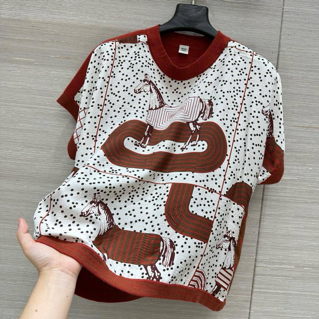 Футболка Hermes LUX-115982 представляет собой стильную вещь от известного бренда. Основной цвет футболки — белый, с рисунком в виде лошадей и темно-коричневым обрамлением воротника и рукавов. Дизайн подходит для создания элегантных образов в повседневной жизни.