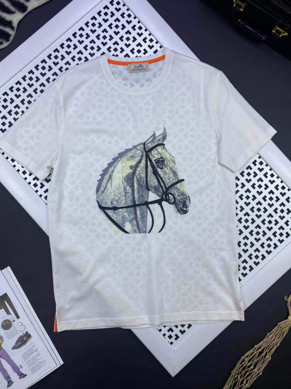 Hermes Футболка LUX-50210 – это стильная и комфортная модель, выполненная в классическом дизайне с оригинальным принтом. Футболка украшена изображением головы лошади в уздечке, что придает ей элегантности и изысканности. Модель идеально подходит для создания повседневных и спортивных образов, подчеркивая индивидуальность владельца.