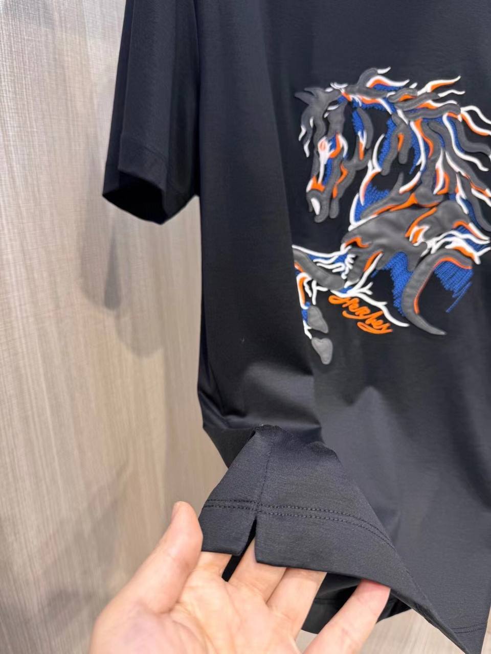 Футболка мужская Hermes LUX-119271 - это стильная футболка от известного бренда. Она выполнена в черном цвете с ярким принтом в виде лошади. Футболка имеет классический крой и подойдет для повседневной носки.