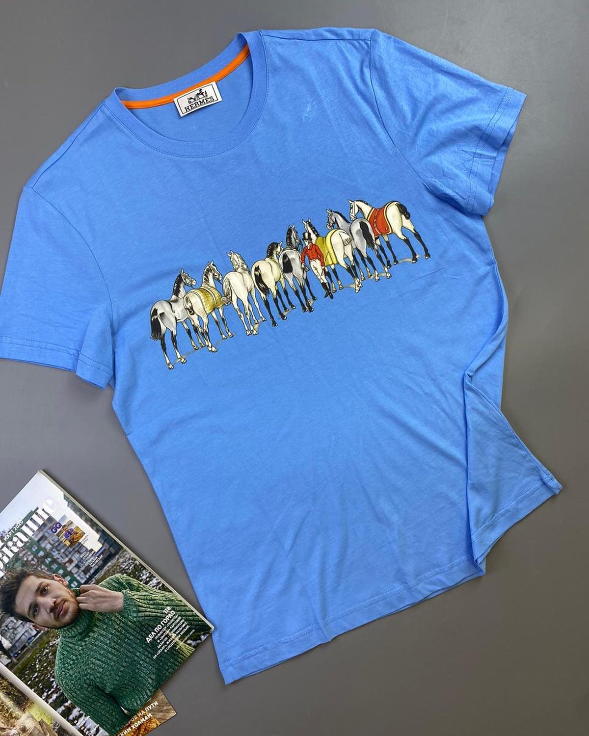 Футболка мужская Hermes LUX-32907 — это стильный и комфортный элемент гардероба, выполненный в оттенке небесно-голубого. На груди футболки расположен яркий принт с изображением вереницы лошадей, что придает изделию оригинальность и подчеркивает изысканный вкус владельца. Благодаря классическому дизайну и качественным материалам, футболка идеально подходит для повседневного ношения, сочетаясь как с джинсами, так и со спортивными брюками.