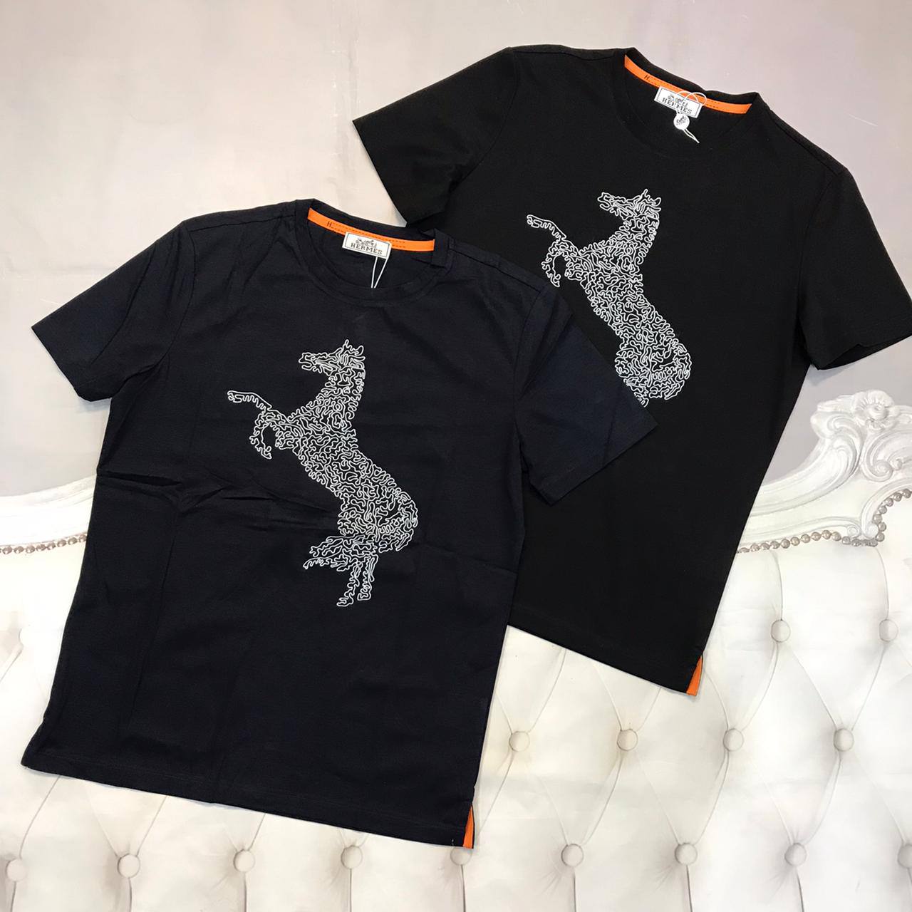 Hermes Футболка мужская LUX-65718 — это стильная и комфортная футболка для мужчин, выполненная в классическом черном цвете. Модель украшена оригинальным принтом в виде стилизованной лошади, что добавляет ей элегантности и узнаваемости. Эта футболка идеально подойдет для создания повседневных и более изысканных образов.