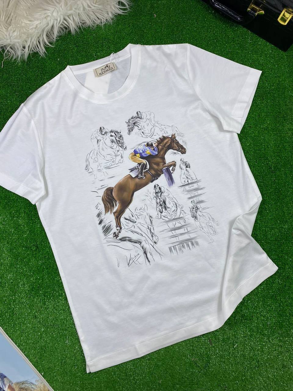 Эта мужская футболка Hermes LUX-65894 представляет собой стильный элемент гардероба с уникальным принтом, изображающим конный спорт. Классический крой и белый цвет делают ее универсальной основой для множества образов. Оригинальный дизайн подчеркнет вашу индивидуальность и любовь к активному образу жизни.