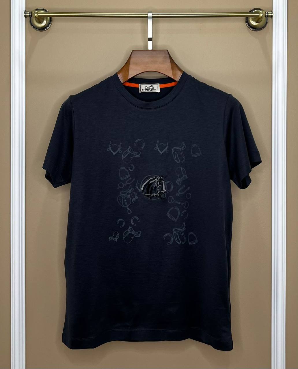 Футболка мужская Hermes LUX-104761 - это стильный элемент гардероба от известного бренда. Футболка выполнена в классическом стиле с круглым вырезом, украшенная принтом с изображением конной тематики. Темно-синий цвет придает ей элегантность, что делает ее отличным выбором для создания как повседневных, так и более изысканных образов.
