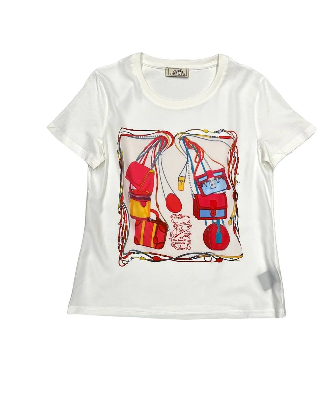 Футболка женская Hermes LUX-67356 – это стильный элемент гардероба, сочетающий в себе комфорт и элегантность. Футболка выполнена в белом цвете и украшена уникальным принтом с изображением ярких сумочек, придающим ей оригинальность. Идеально подходит для создания непринужденных, но изысканных образов.