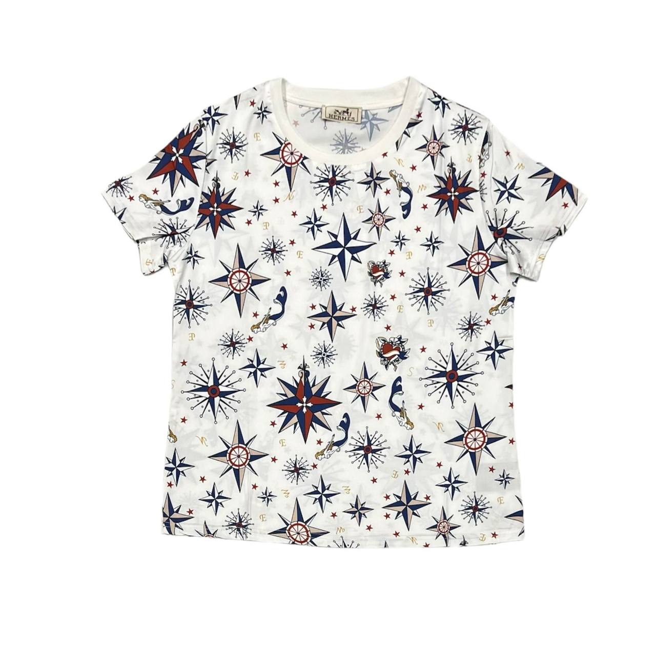 Эта женская футболка Hermes LUX-67359 выполнена в морской тематике, украшена принтом с изображениями компасов, морских звезд и русалок. Стильный дизайн делает ее отличным выбором для создания ярких и запоминающихся образов. Футболка идеально подойдет для повседневного ношения, прогулок и встреч с друзьями.