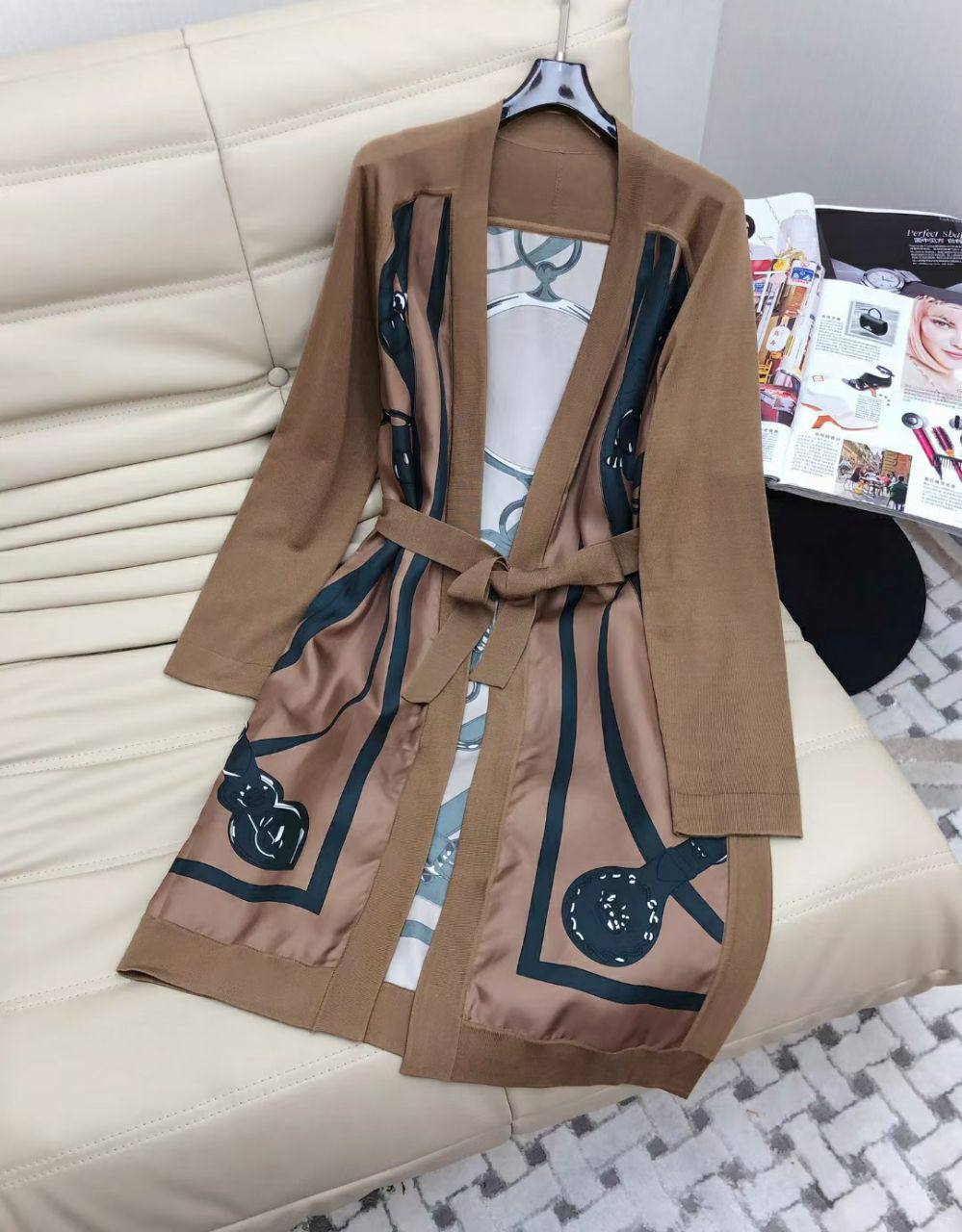 Кардиган Hermes LUX-74535 – это стильный предмет гардероба, сочетающий в себе элегантность и комфорт. Кардиган выполнен в благородном коричневом цвете, с узором на шелковой вставке. Он идеально подойдет для создания как повседневных, так и более формальных образов.