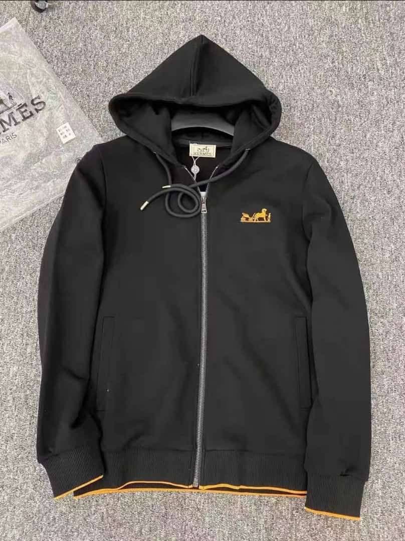 Кофта Hermes LUX-57826 представляет собой стильную черную толстовку на молнии с капюшоном. Эта модель в стиле casual идеально подойдет для создания непринужденных образов, сочетая комфорт и элегантность. Лаконичный дизайн подчеркивается вышитым золотистым логотипом бренда на груди, а контрастная оранжевая полоска по низу и манжетам добавляет изюминку.