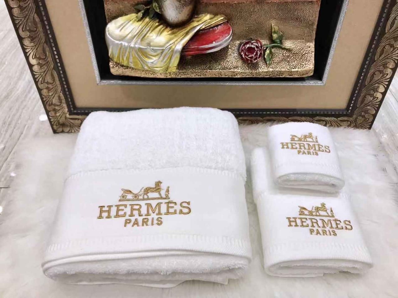 Комплект полотенец Hermes LUX-19307 представляет собой изысканный набор, выполненный в классическом стиле, который добавит роскоши в вашу ванную комнату. Этот комплект, украшенный узнаваемым логотипом бренда, идеально подойдет для тех, кто ценит высокое качество и элегантность.