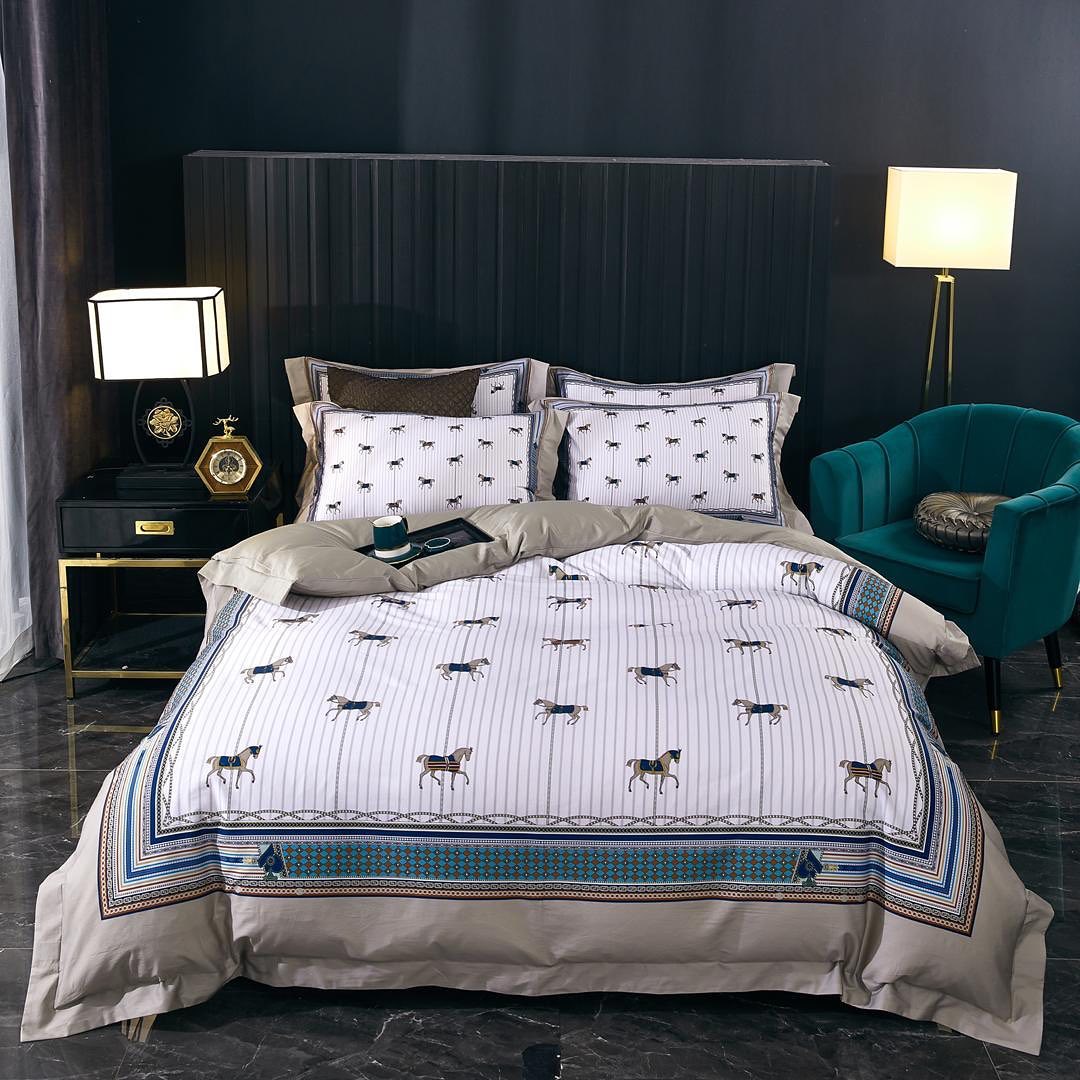 Комплект постельного белья Hermes LUX-34397 представляет собой элегантное решение для спальни, выполненное в классическом стиле. Комплект состоит из пододеяльника, наволочек и простыни, декорированных изящным принтом с изображением лошадей на полосатом фоне. Бордюр с геометрическим узором добавляет изысканности.