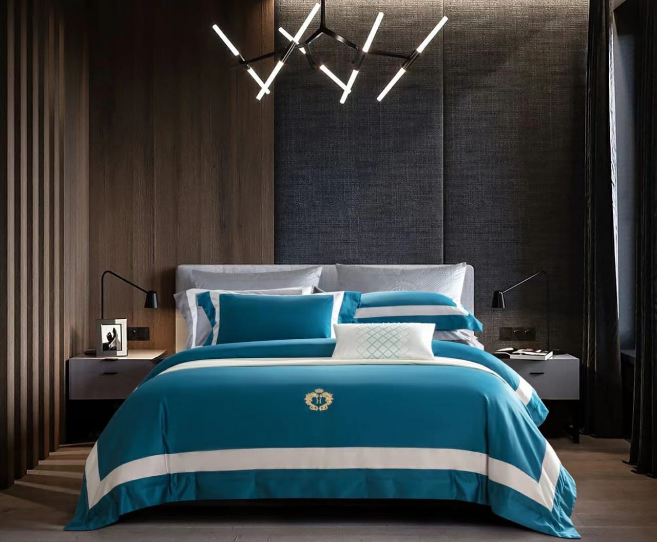 Комплект постельного белья Hermes LUX-45161 — это элегантное решение для спальни, выполненное в современном стиле. Его насыщенный бирюзовый цвет в сочетании с белыми полосами и фирменной вышивкой придает интерьеру роскошный вид. Этот комплект идеально подходит для создания уютной и стильной атмосферы в спальне.