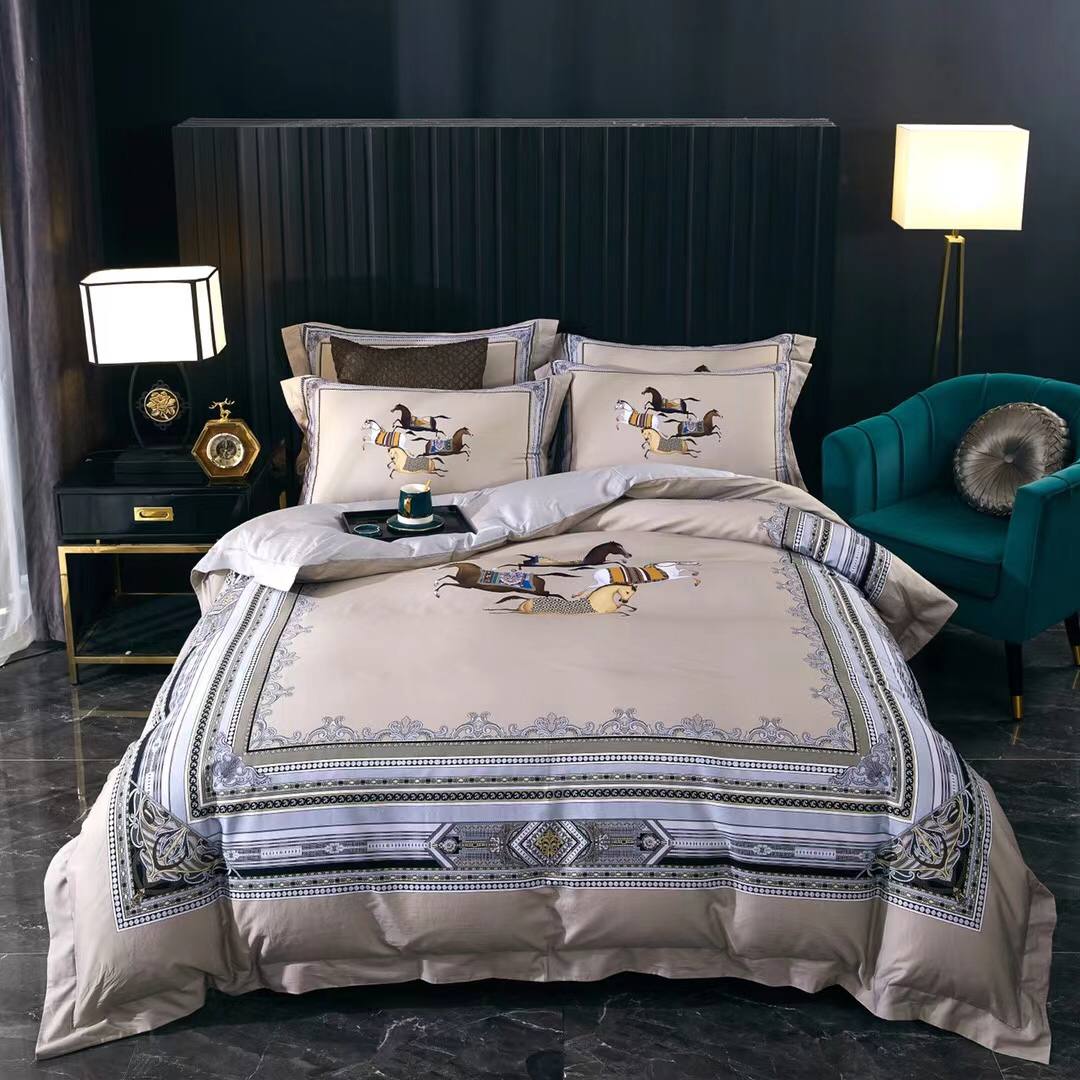 Комплект постельного белья Hermes LUX-49405 выполнен в классическом стиле с элегантным принтом, изображающим бегущих лошадей. Комплект создает атмосферу роскоши и изысканности в спальне, придавая интерьеру утонченный вид.
