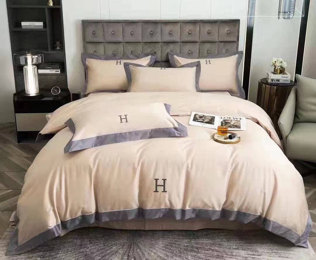 Комплект постельного белья Hermes LUX-64009 предлагает изысканное решение для спальни, сочетая классический дизайн с современным стилем. Этот комплект, выполненный в нежных кремовых тонах с элегантной серой отделкой, украшен узнаваемым монограммой "H", придающей изделию особый шарм. Безупречное качество и внимание к деталям делают его идеальным выбором для создания роскошной атмосферы в вашей спальне.