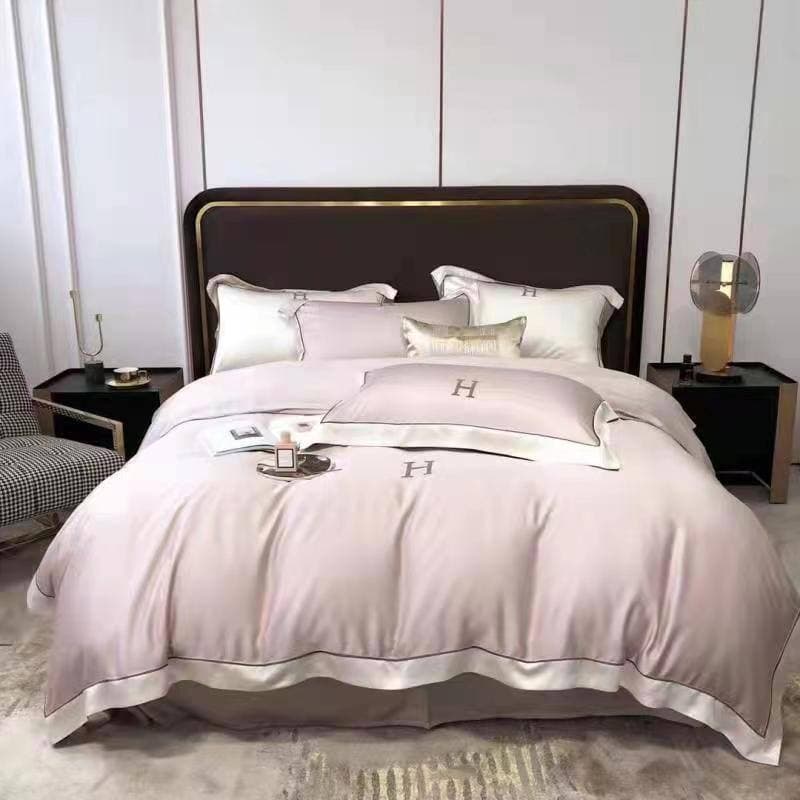 Комплект постельного белья Hermes LUX-64015 представляет собой роскошное решение для спальни, выполненное в классическом стиле. Нежный пудровый оттенок в сочетании с элегантной вышивкой в виде монограммы "H" придает ему изысканный и утонченный вид, создавая атмосферу комфорта и элегантности.