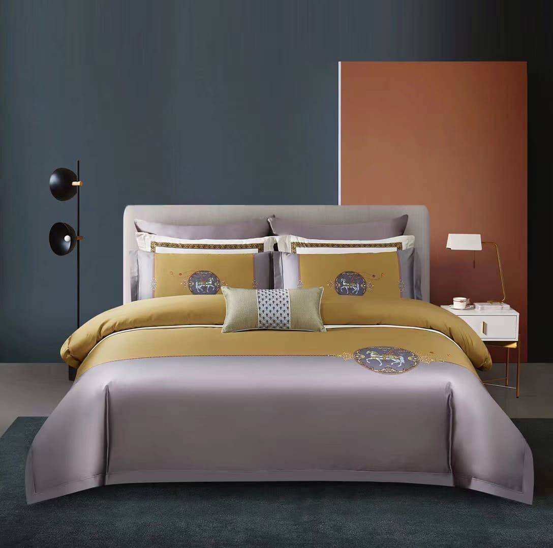 Комплект постельного белья Hermes LUX-69951 представляет собой роскошный текстиль для спальни. Комплект выполнен в элегантном стиле, сочетает в себе серые и золотистые оттенки с изысканными декоративными элементами. Подойдет для создания атмосферы уюта и комфорта в спальне.
