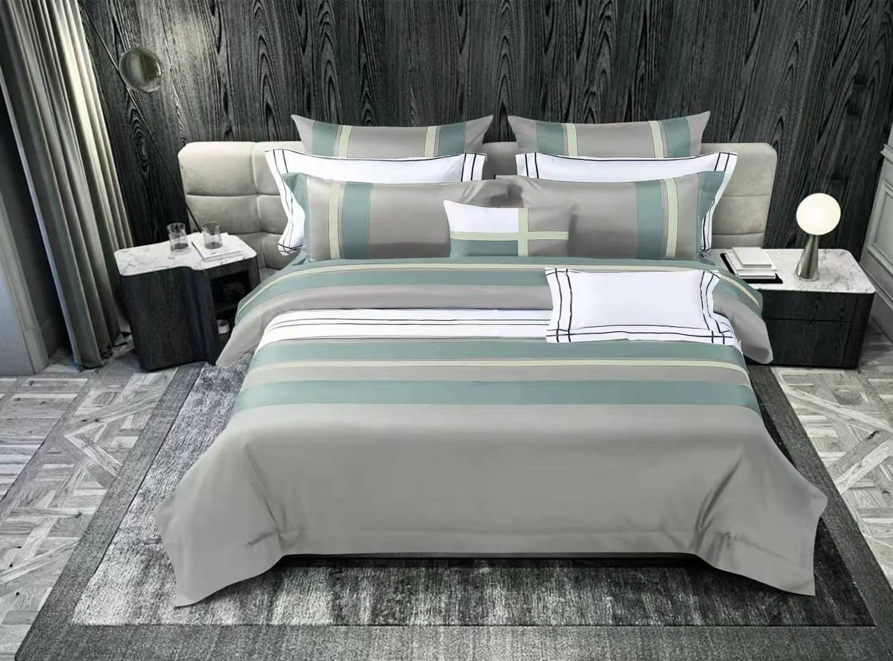 Комплект постельного белья Hermes LUX-72875 представляет собой изысканный текстильный набор, выполненный в современном стиле. Комплект включает в себя предметы постельного белья в серых, белых и бирюзовых тонах, украшенные полосатым узором, а также элементами декора в виде контрастных полос. Это изделие предназначено для создания атмосферы комфорта и уюта в спальне.