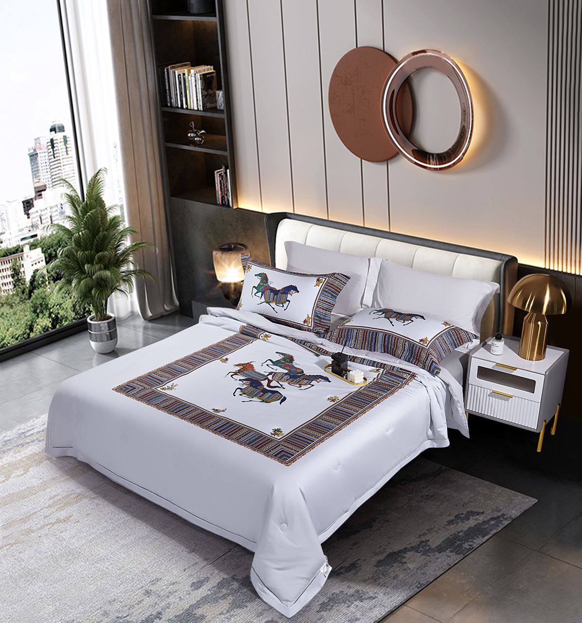 Комплект постельного белья Hermes LUX-75643 сочетает в себе элегантность и комфорт. Белое полотно украшено узором с изображением лошадей и обрамлено декоративной полосой, добавляющей изысканности. Этот комплект создан для создания уютной атмосферы в спальне.