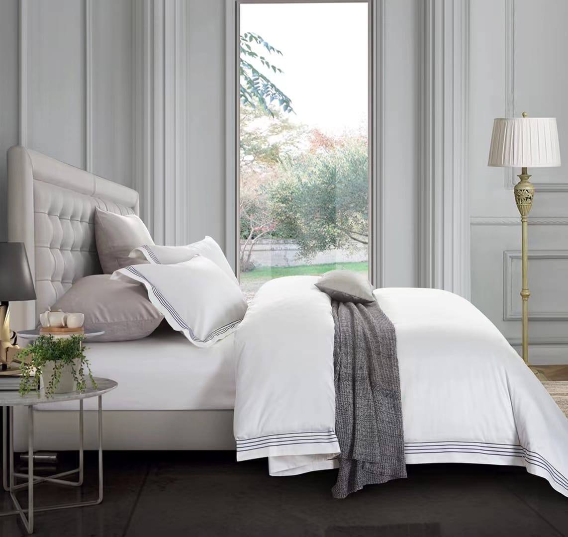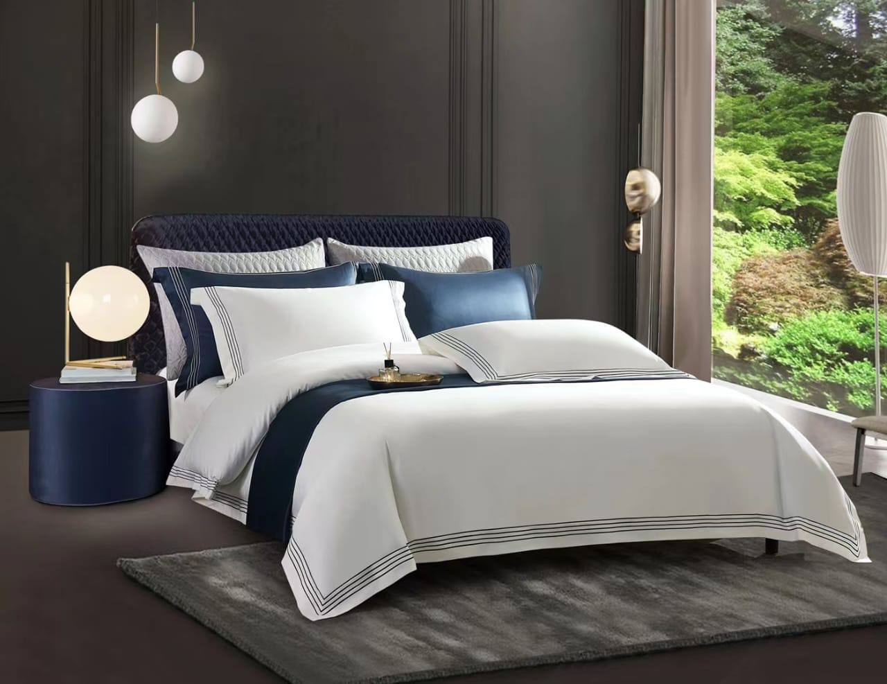 Комплект постельного белья Hermes LUX-94086, представлен в изысканном стиле, сочетающем элегантность и комфорт. Основной цвет комплекта — белый, дополненный тёмно-синими элементами и декоративными линиями, создающими визуальный контраст. Такой дизайн идеально подходит для спальни, придавая ей утонченный и современный вид.
