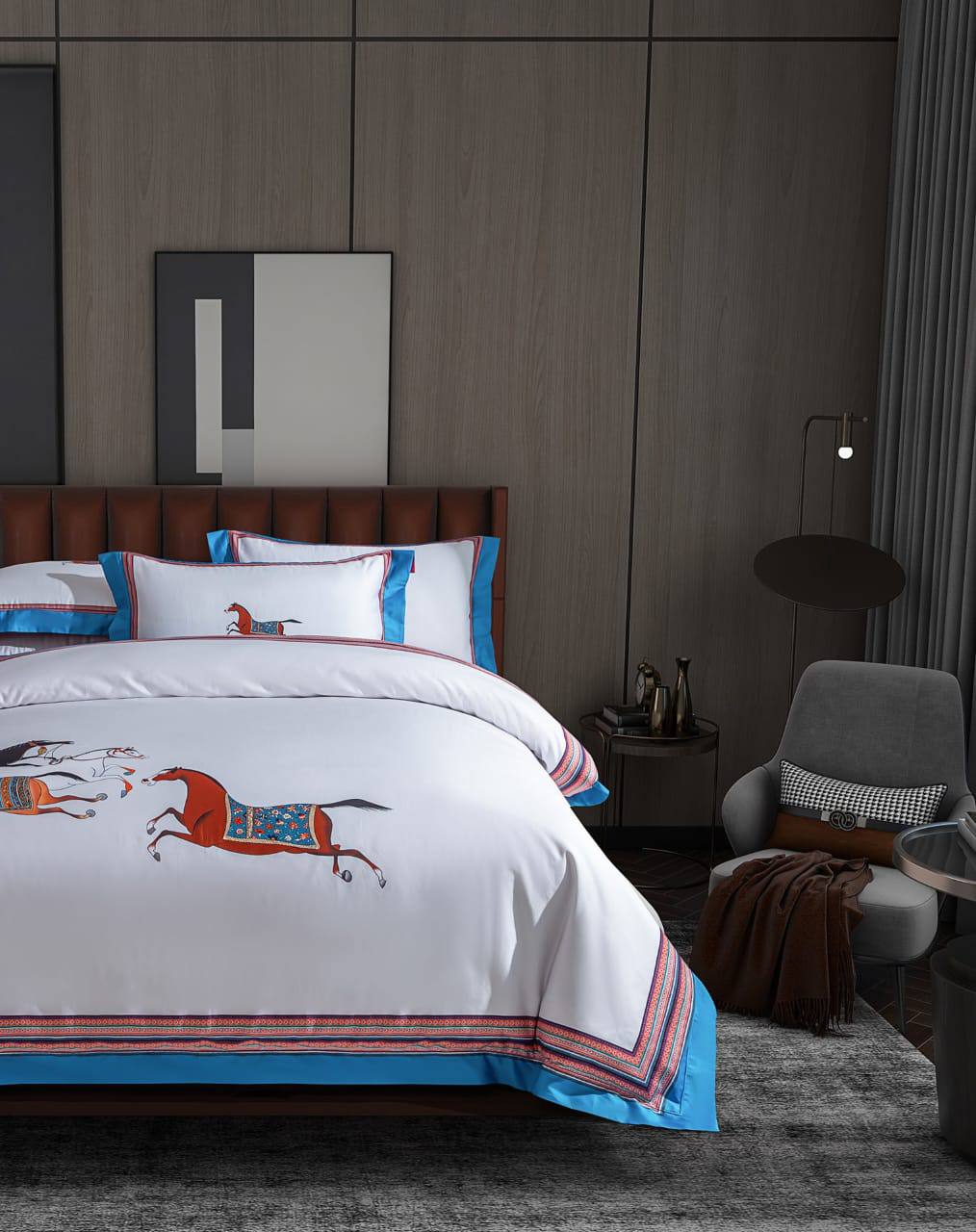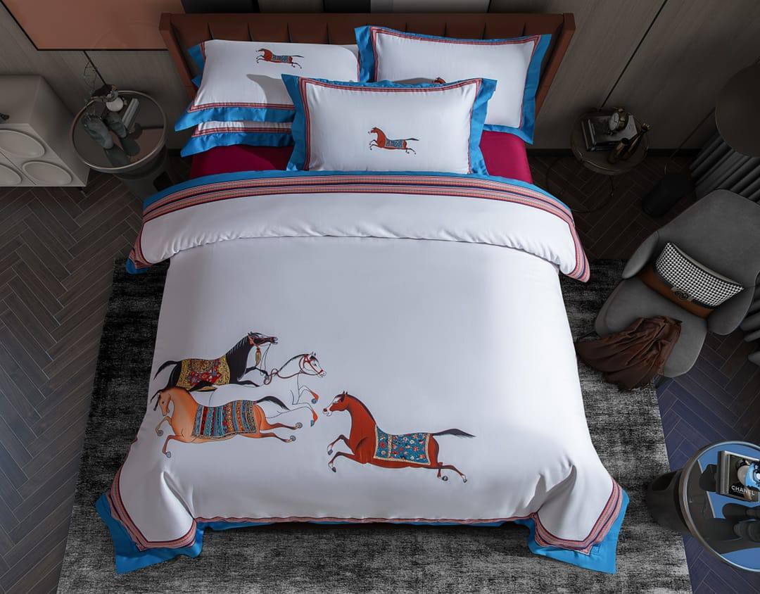Комплект постельного белья Hermes LUX-130680 – это элегантный комплект, который привнесет нотку роскоши и стиля в вашу спальню. Он выполнен в изысканном дизайне с изображением лошадей, что придает ему особый шарм.