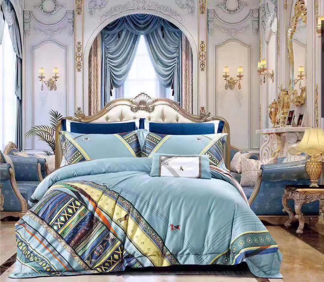 Комплект постельного белья Hermes LUX-26053 от Hermes выполнен в элегантном стиле, сочетая в себе классические мотивы и современные дизайнерские решения. Нежный голубой цвет основной ткани гармонично дополнен яркими геометрическими узорами и стилизованными изображениями лошадей, что придает комплекту изысканный и роскошный вид. Этот комплект станет центральным элементом спальни, создавая атмосферу уюта и изысканности.