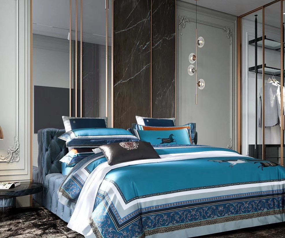 Комплект постельного белья ЕВРО MAX Hermes LUX-35612 от LUXE CRIME представляет собой элегантное решение для вашей спальни, выполненное в современном стиле с элементами классики. Дизайн украшен изысканным принтом с изображением лошадей и геометрическими узорами, создавая атмосферу роскоши и утонченности.