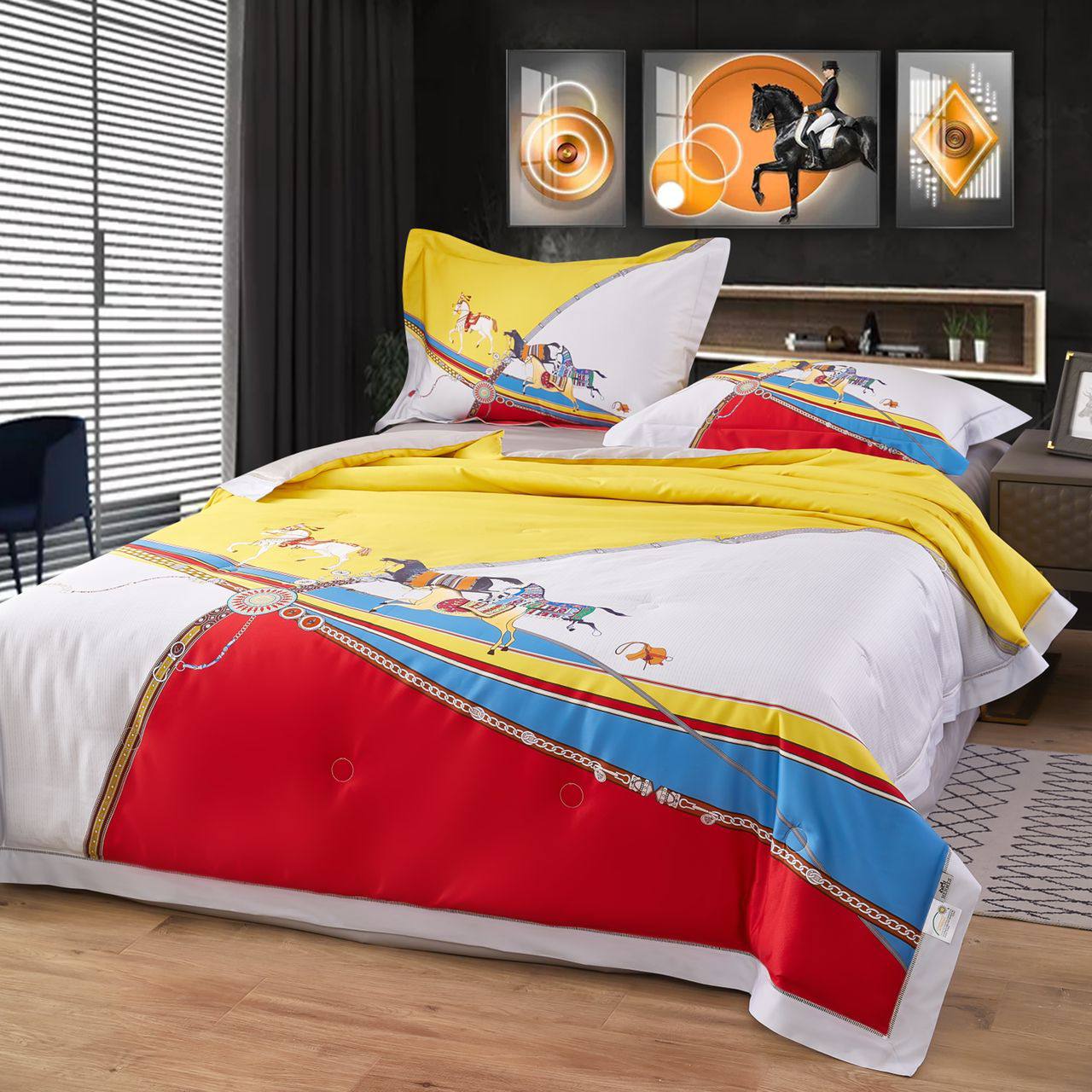 Комплект постельного белья СЕМЕЙНЫЙ Hermes LUX-67278 выполнен в ярком и эксклюзивном дизайне, вдохновленном конным спортом. Сочетание насыщенного красного, синего и солнечного желтого цветов создает динамичный образ, дополненный изящным принтом с изображением лошадей и элементов декора. Этот комплект привнесет в вашу спальню атмосферу роскоши и элегантности, обеспечивая при этом комфортный сон.