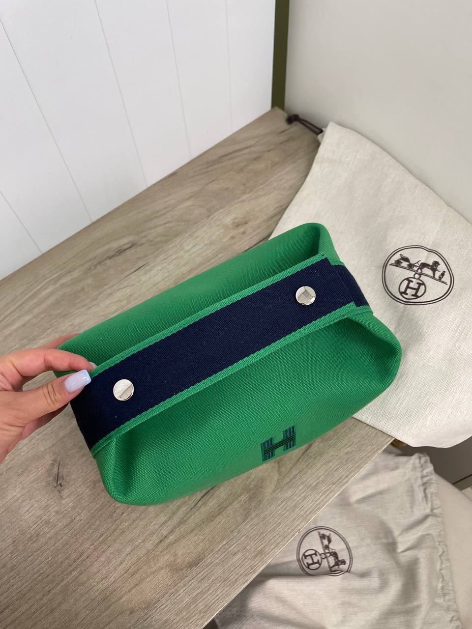 Косметичка 25 см Hermes LUX-88948, представленная на изображении, — это стильный аксессуар для хранения косметики. Косметичка выполнена в ярком зеленом цвете с контрастным логотипом бренда. Ее прямоугольная форма и ручка обеспечивают удобство использования.