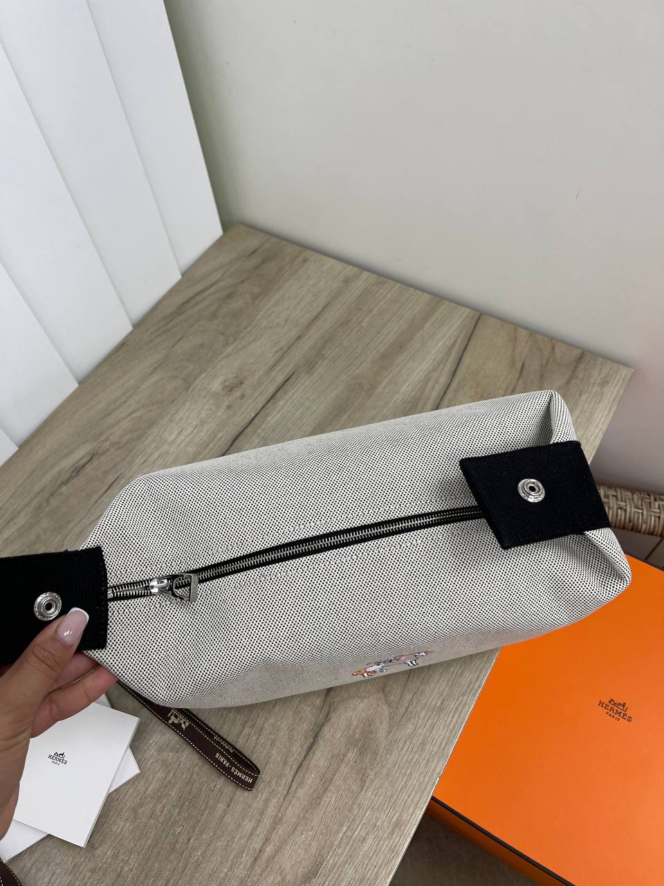 Косметичка Hermes LUX-93033 – это стильный аксессуар для хранения косметики и других мелочей. Косметичка выполнена в классическом стиле Hermes, сочетает в себе элегантность и функциональность. Светлый цвет изделия в сочетании с черной фурнитурой и вышивкой делают ее узнаваемой и привлекательной.