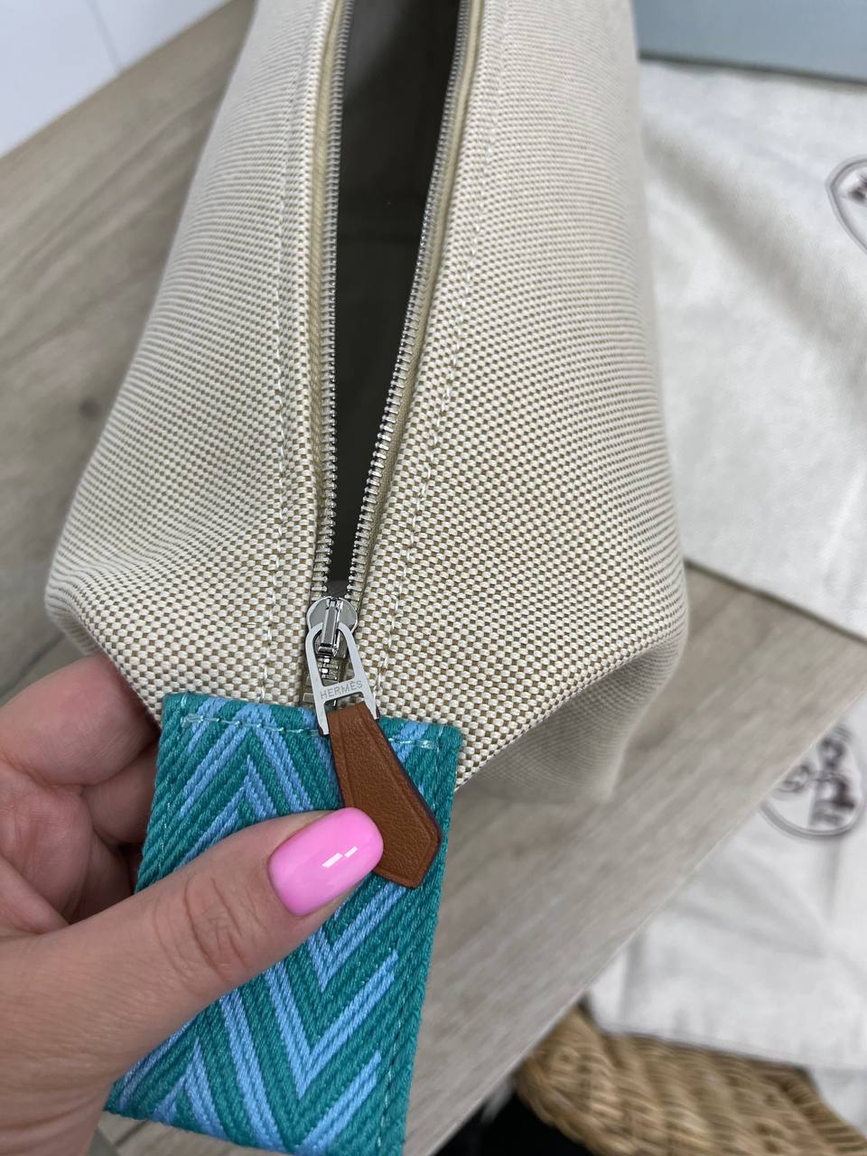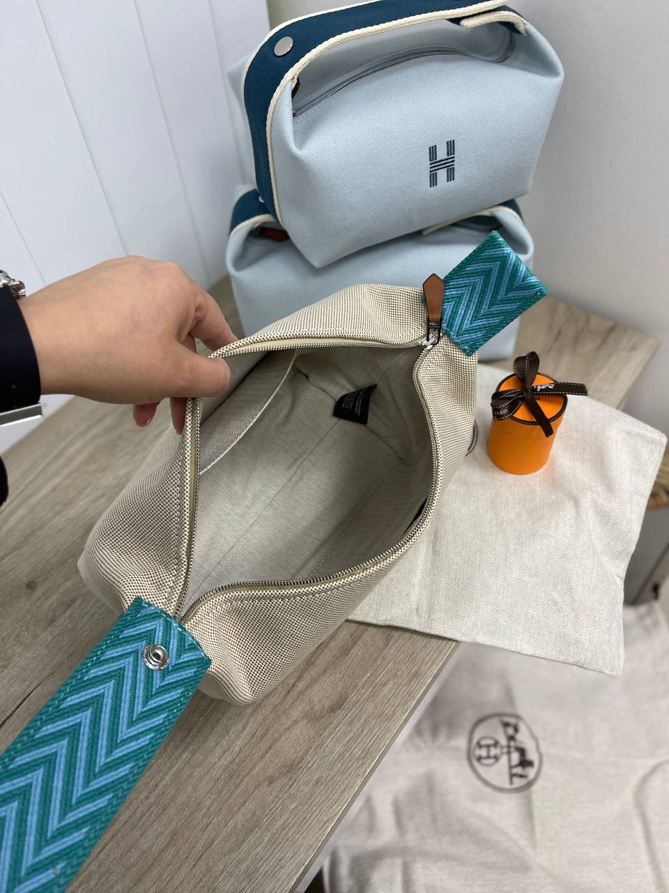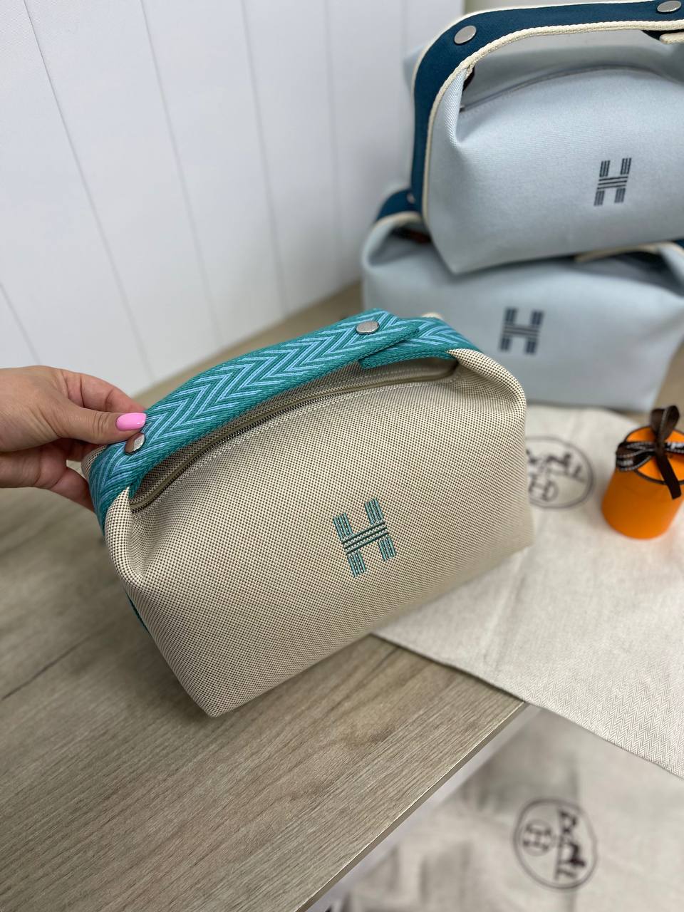 Косметичка 25 см Hermes LUX-85013 - это стильный аксессуар от Hermes, выполненный в элегантном дизайне. Косметичка имеет светлый оттенок с вышитым логотипом и контрастной ручкой бирюзового цвета. Прекрасно подойдет для хранения косметики и других мелочей.