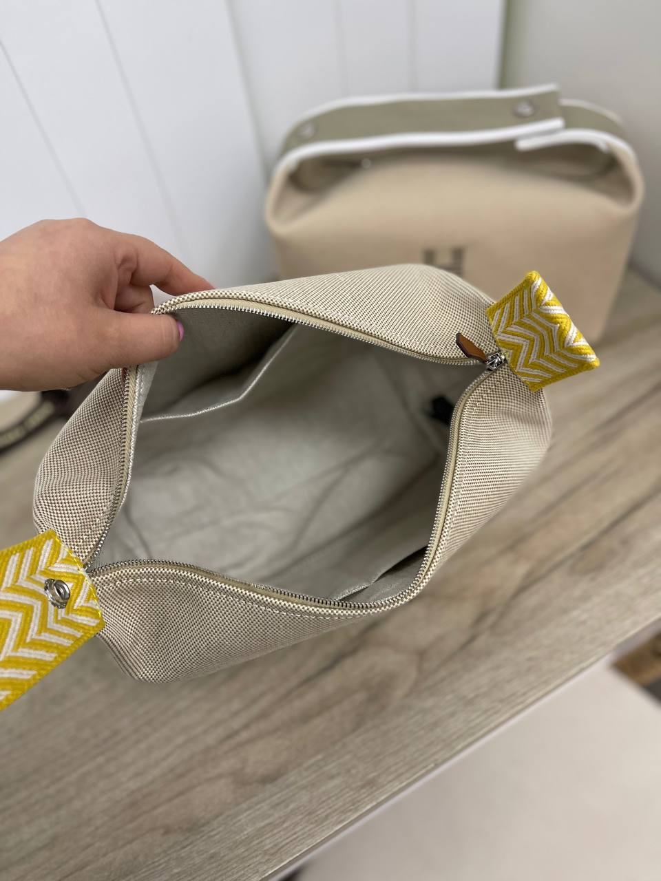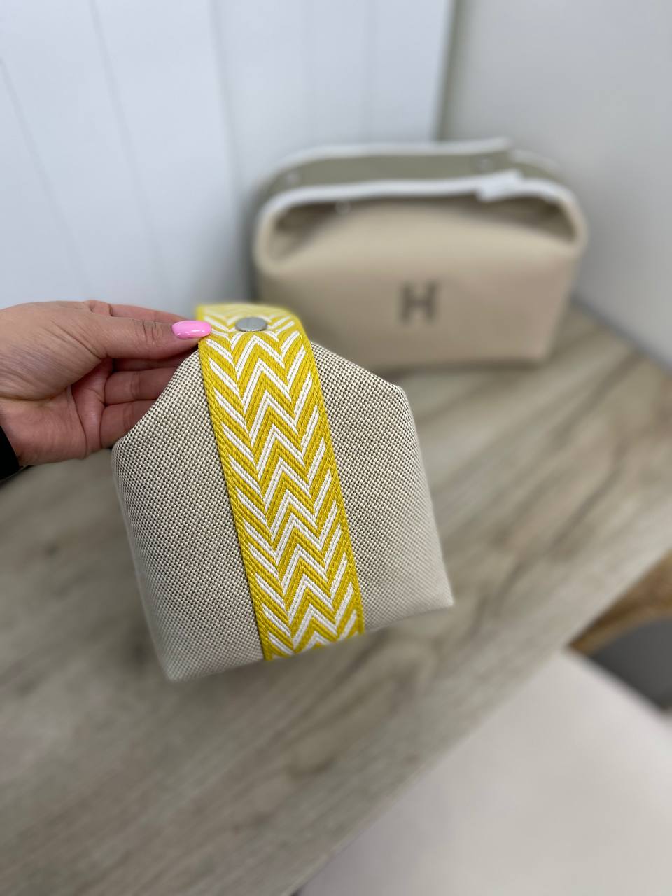 Косметичка 25 см Hermes LUX-85074 — это стильный аксессуар, выполненный в фирменном стиле бренда. Косметичка выполнена в бежевом цвете с вышитым логотипом "H" в жёлтом цвете. Жёлтая ручка-петля с геометрическим узором делает её яркой и выразительной.