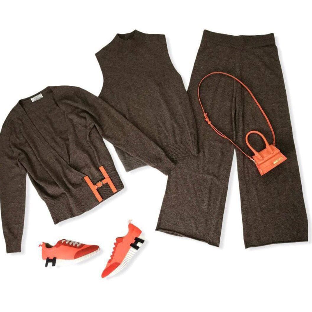 Костюм женский Hermes LUX-61843 представляет собой элегантный и современный ансамбль, сочетающий в себе утонченность бренда Hermes и актуальные тенденции моды. Комплект выполнен в спокойном коричневом цвете, а контрастные оранжевые детали, в виде фирменного логотипа "H" на кардигане и обуви, добавляют образу динамичности и запоминаемости. Этот костюм идеально подходит для создания стильных повседневных или расслабленных вечерних образов.