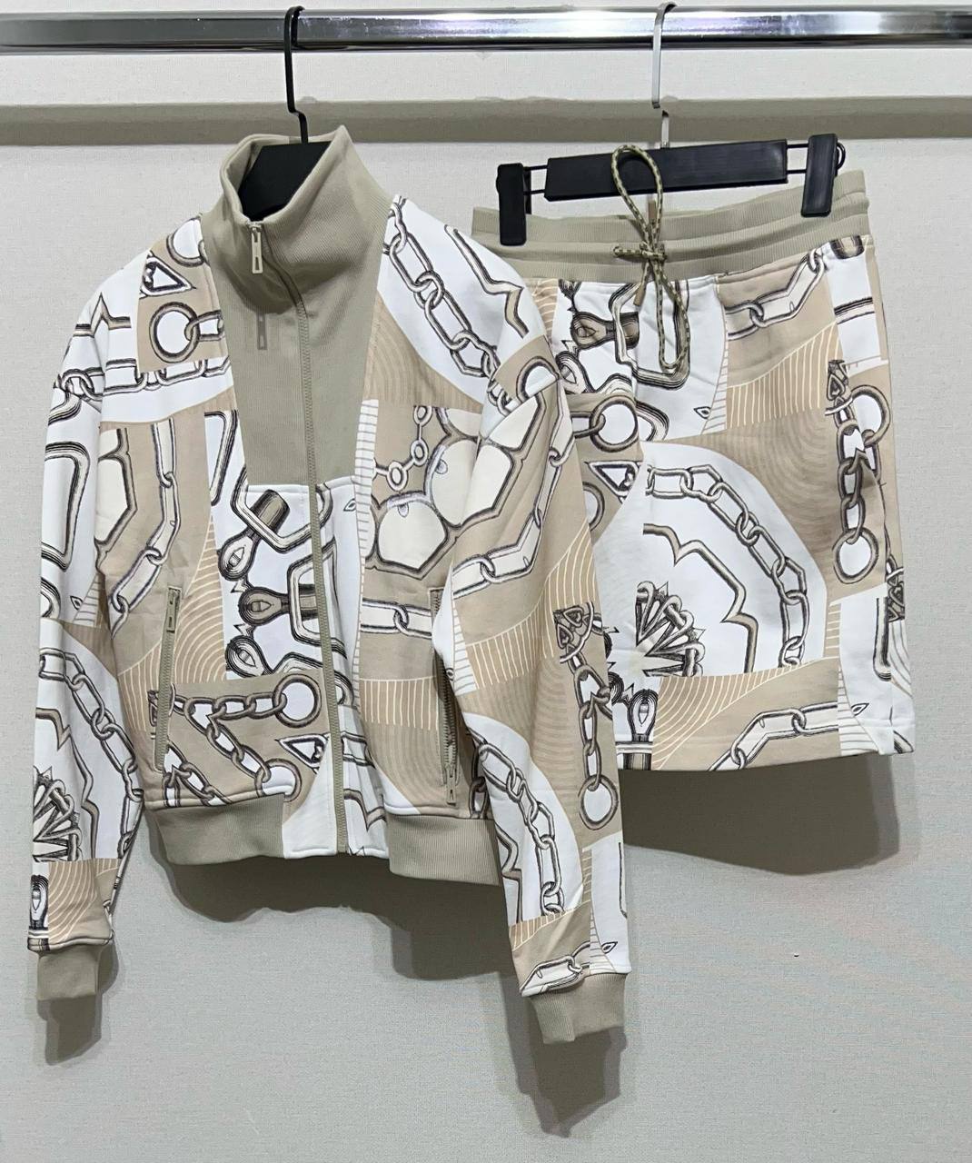 Костюм женский Hermes LUX-115550 - это стильный спортивный костюм, состоящий из куртки и шорт. Костюм выполнен в бежево-белых тонах с узором в виде цепочек и логотипов. Этот костюм станет отличным выбором для повседневного гардероба.