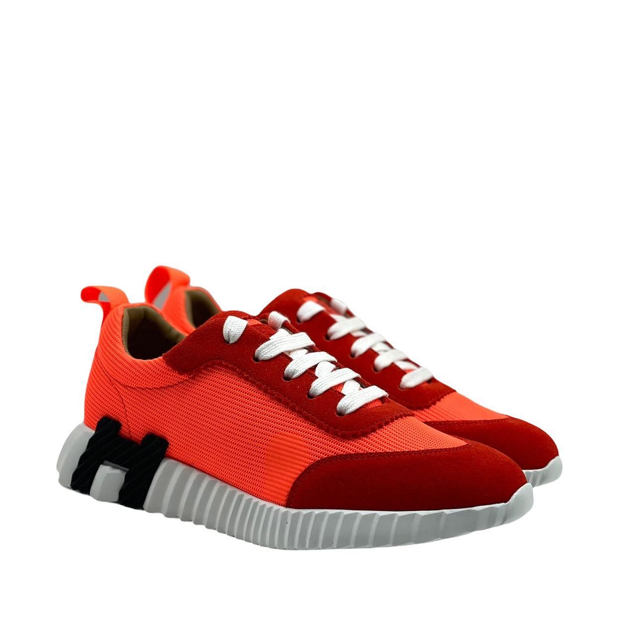 Эти кроссовки Hermes LUX-42384 сочетают в себе спортивный стиль и изысканный дизайн, характерный для бренда. Яркий оранжевый цвет в сочетании с красными замшевыми вставками и белой шнуровкой создают динамичный и модный образ. Ребристая подошва с контрастным черным элементом добавляет уникальности.