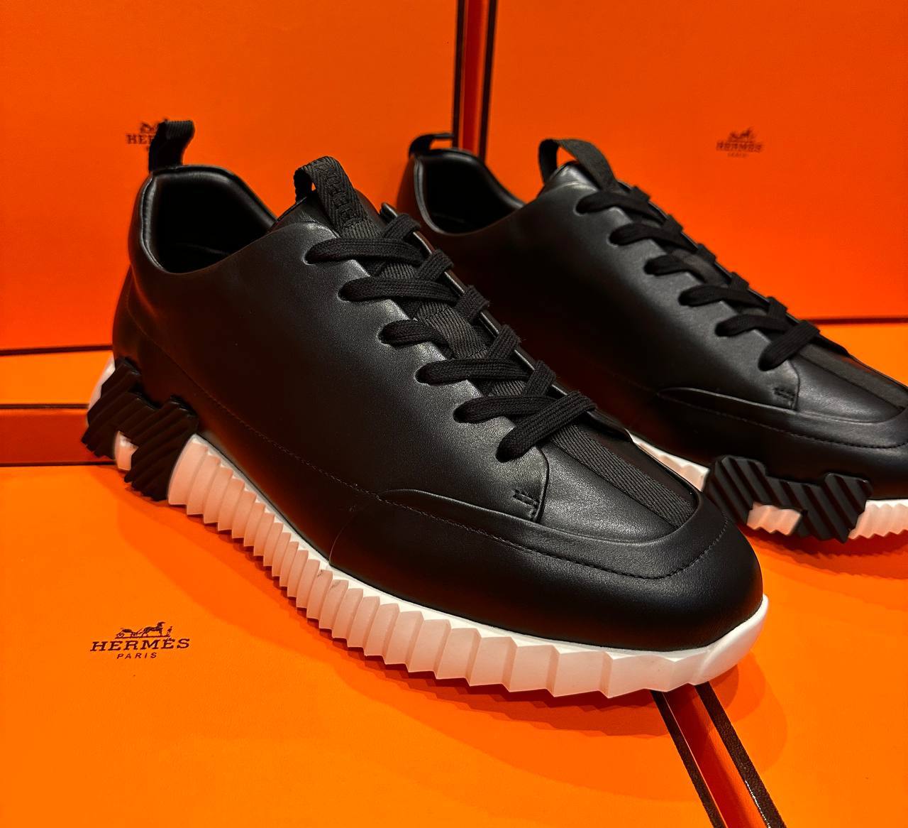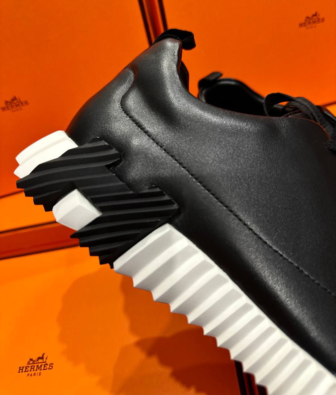 Кроссовки Hermes LUX-109497, представленные на изображении, сочетают в себе элегантность и спортивный стиль. Модель выполнена в классическом черном цвете с контрастной белой подошвой, создавая современный и универсальный образ. Кроссовки подойдут как для повседневной носки, так и для создания модных ансамблей.