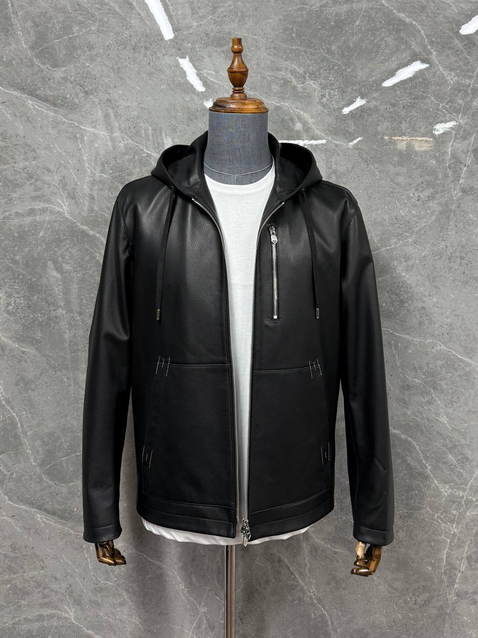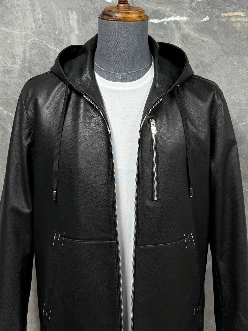 Кожаная куртка Hermes LUX-118447 - это стильная куртка черного цвета, выполненная в спортивном стиле с капюшоном. Она имеет текстурированную поверхность и молнию для удобной застежки. Эта куртка отлично подойдет для повседневной носки, добавляя образу изысканности и элегантности.