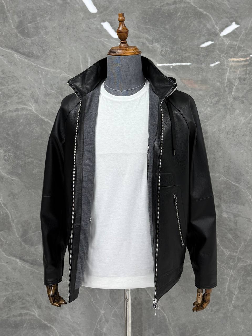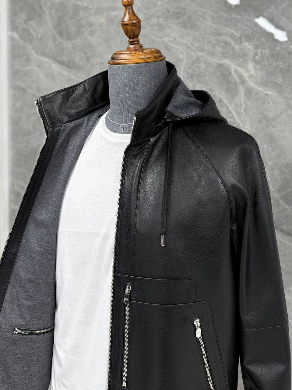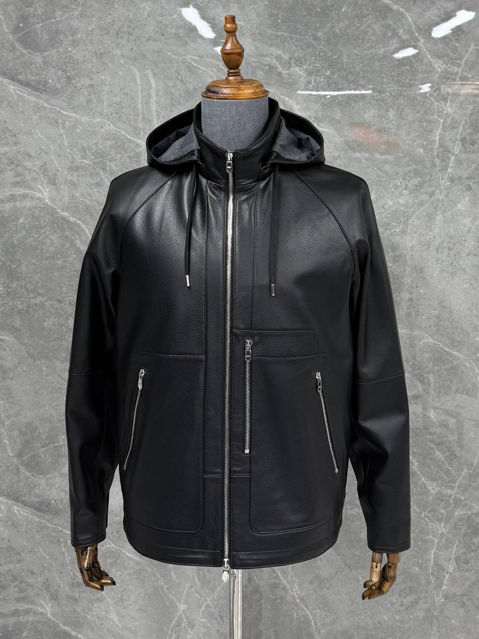 Куртка кожаная Hermes LUX-117646 — это стильная черная кожаная куртка с капюшоном. Куртка выполнена в современном стиле, подходит для повседневной носки. Она имеет выразительную текстуру и элегантный дизайн.