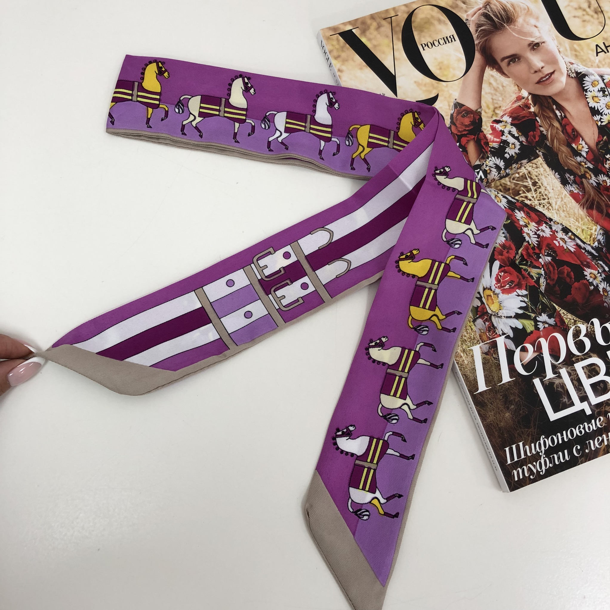 Лента Twilly Hermes LUX-14918 - это утонченный аксессуар, который добавит изысканности любому образу. Этот шелковый платок, украшенный стилизованным принтом с лошадьми и элементами упряжи, выполнен в нежных оттенках фиолетового, розового и бежевого. Он является воплощением элегантности и французского шика, идеально подходит для тех, кто ценит высокое качество и внимание к деталям.