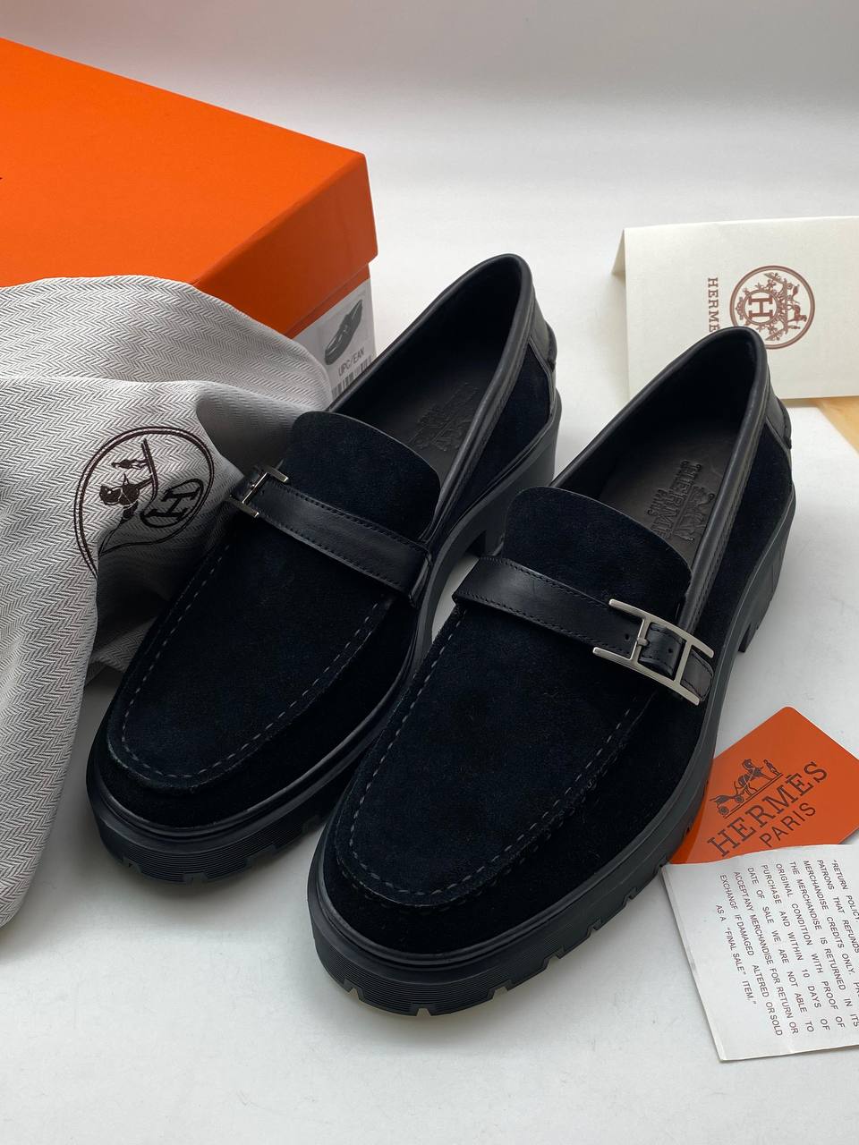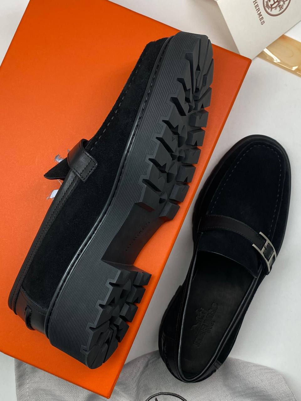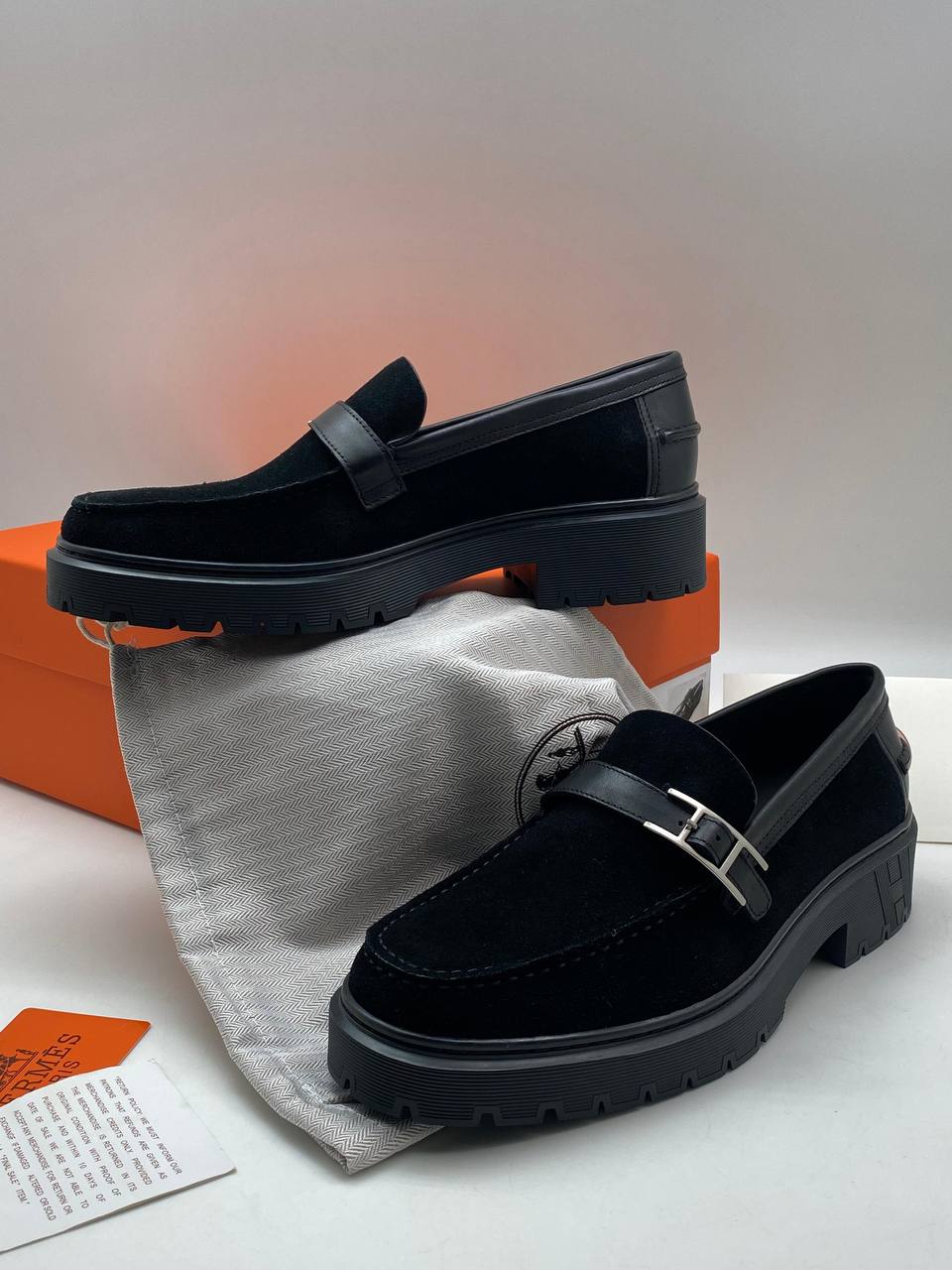 Лоферы Hermes LUX-97729 — это воплощение элегантности и стиля. Лоферы выполнены в классическом черном цвете, имеют прочную текстуру и массивную подошву. Идеальный выбор для тех, кто ценит комфорт и утонченный стиль.