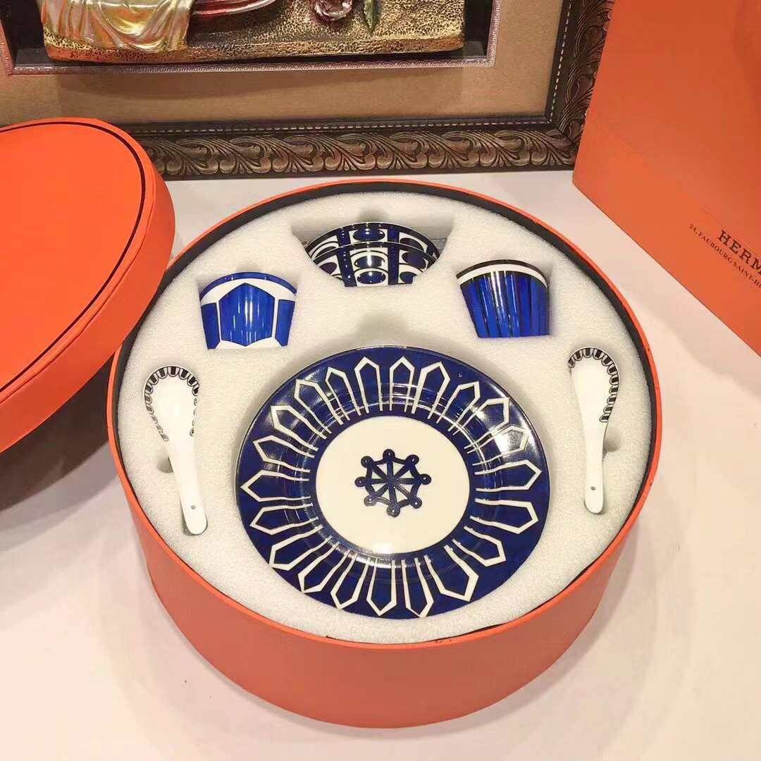 Набор посуды Hermes LUX-100673 — это элегантный сервиз для сервировки стола, сочетающий в себе изысканный дизайн и функциональность. В набор входит блюдо, чашки, тарелочки и ложки. Он выполнен в бело-синих тонах с геометрическим узором, что придает ему стильный и современный вид.