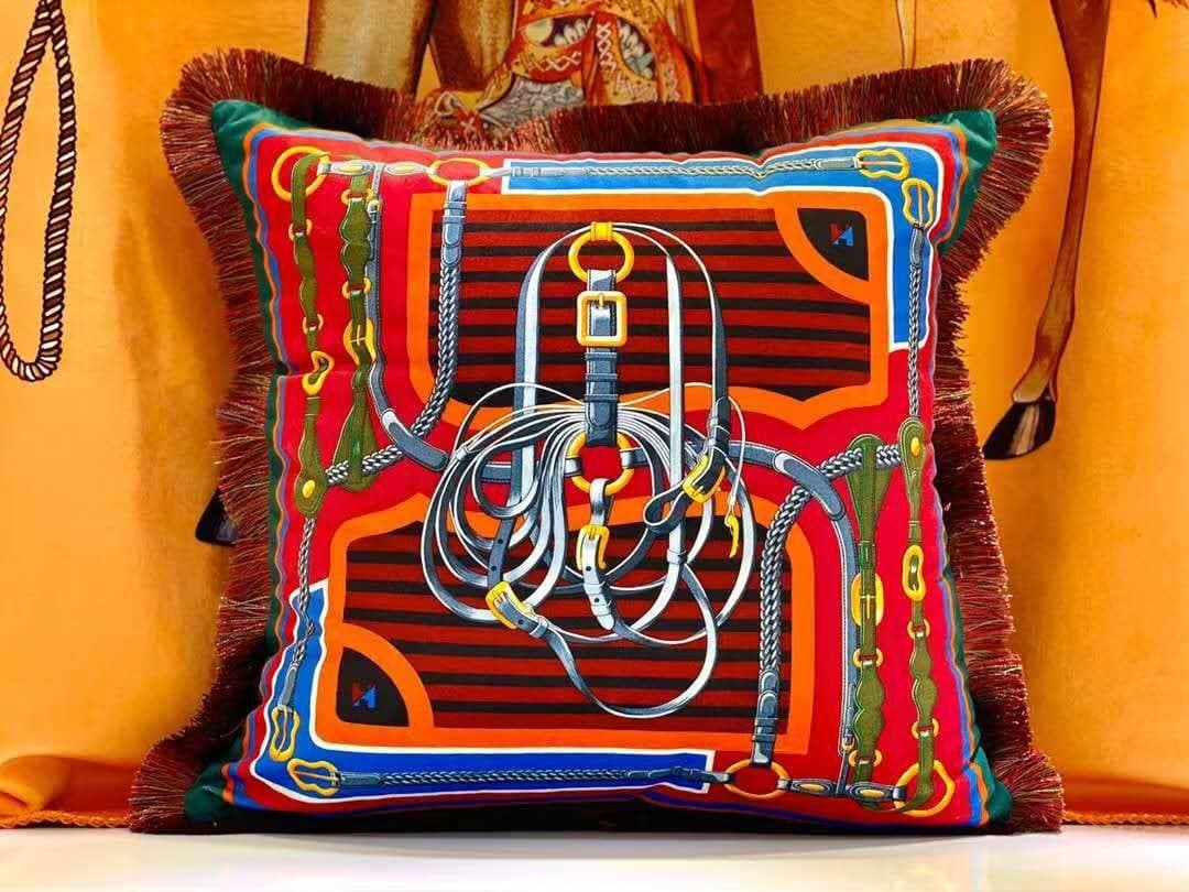 Эта наволочка Hermes LUX-57316 украшена ярким принтом, напоминающим конскую сбрую, выполненным в фирменном стиле бренда. Сочетание насыщенных цветов и изысканного узора делает ее выразительным акцентом в интерьере. Края изделия отделаны декоративной бахромой, добавляя роскоши.