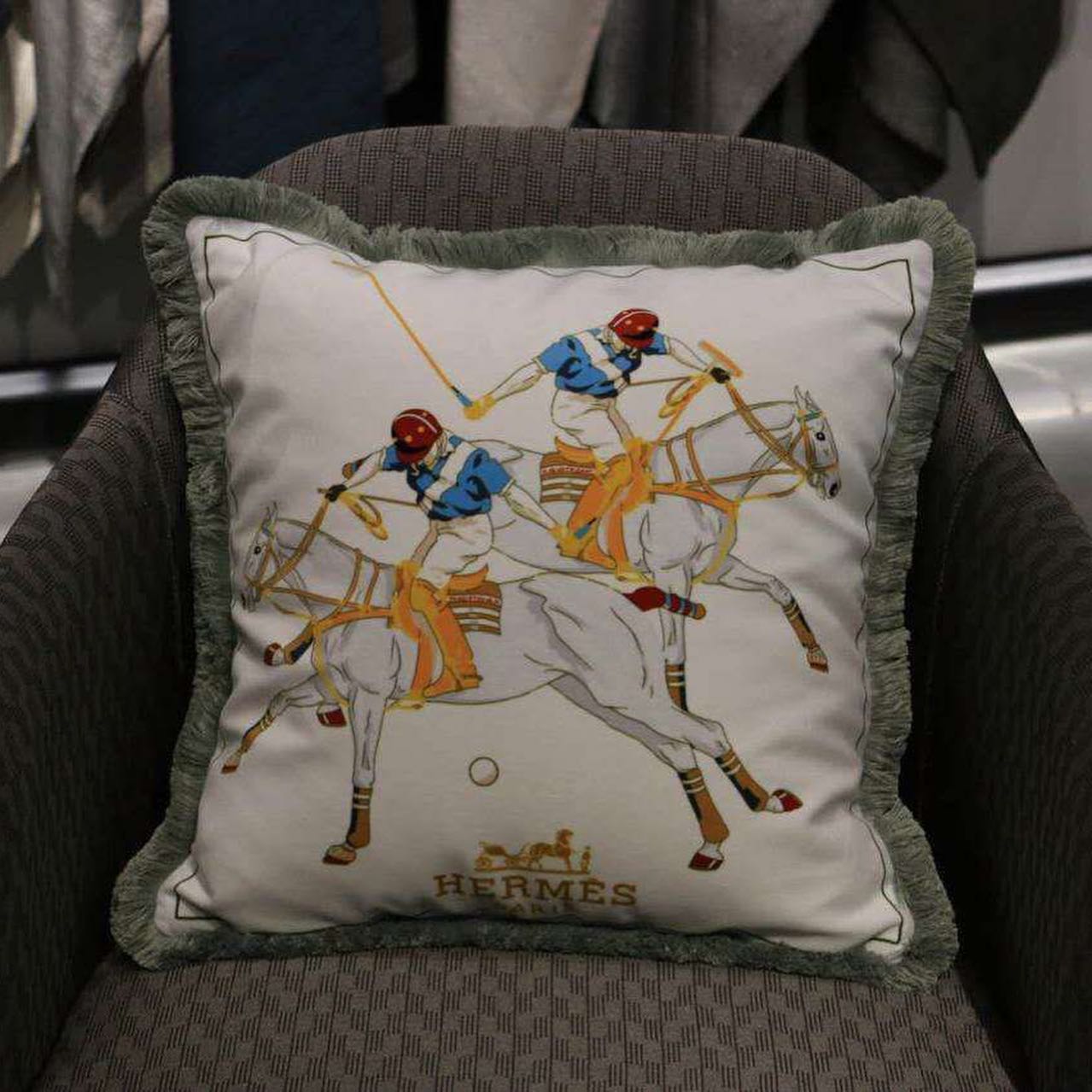 Наволочка для декоративной подушки Hermes LUX-41706 — это изысканный элемент интерьера, выполненный в классическом стиле. Она украшена эффектным принтом с изображением игроков в поло на лошадях, что придает ей особую элегантность и динамичность.