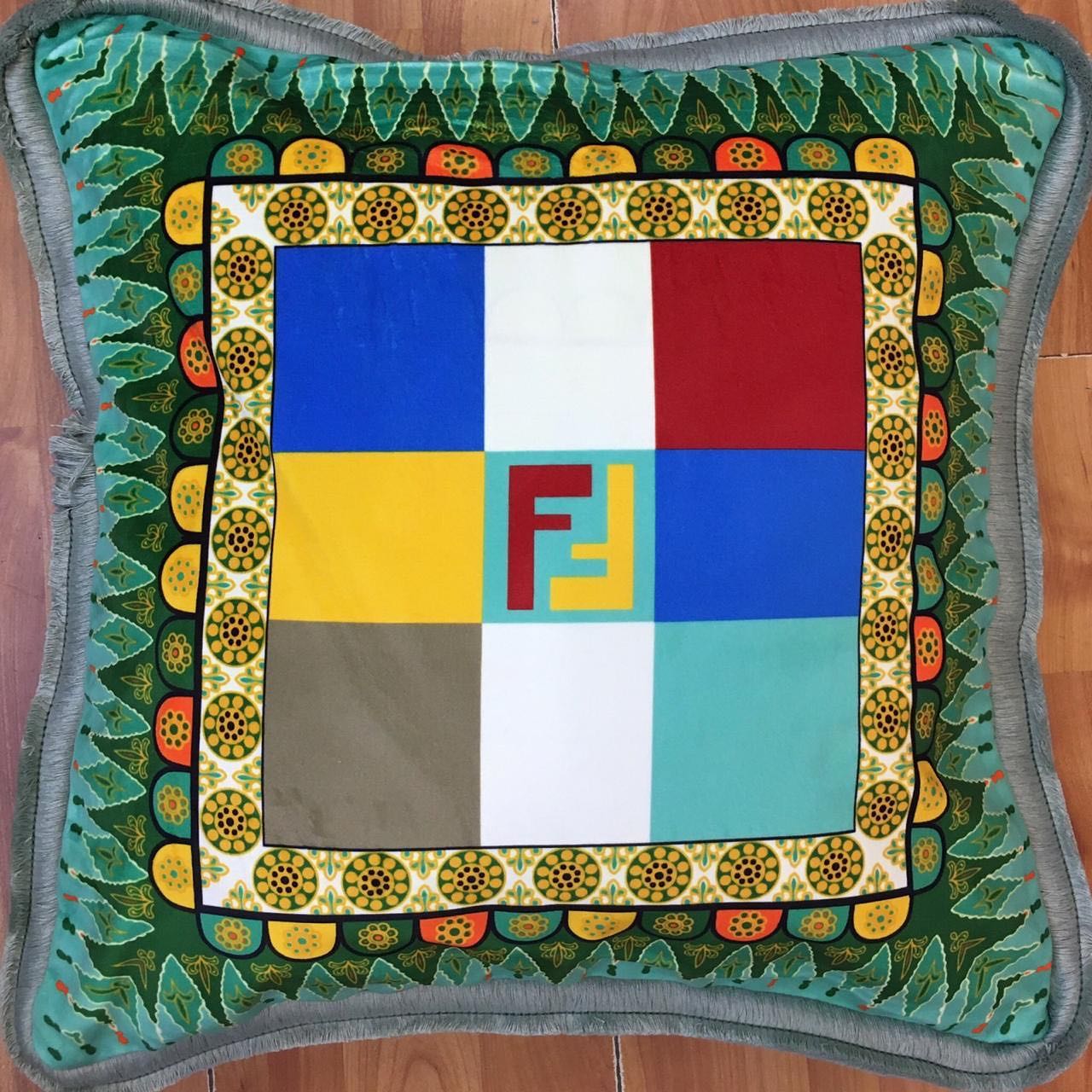 Наволочка для декоративной подушки Hermes LUX-41708 — это яркий и стильный элемент декора, который привнесет изысканность в любое пространство. Ее дизайн отличается геометрическими блоками насыщенных цветов — красного, синего, желтого, голубого, серого и белого, а в центре красуется узнаваемый логотип бренда, выполненный в фирменных оттенках. Кайма с растительным орнаментом и декоративная бахрома по краю добавляют изделию роскоши и завершенности.
