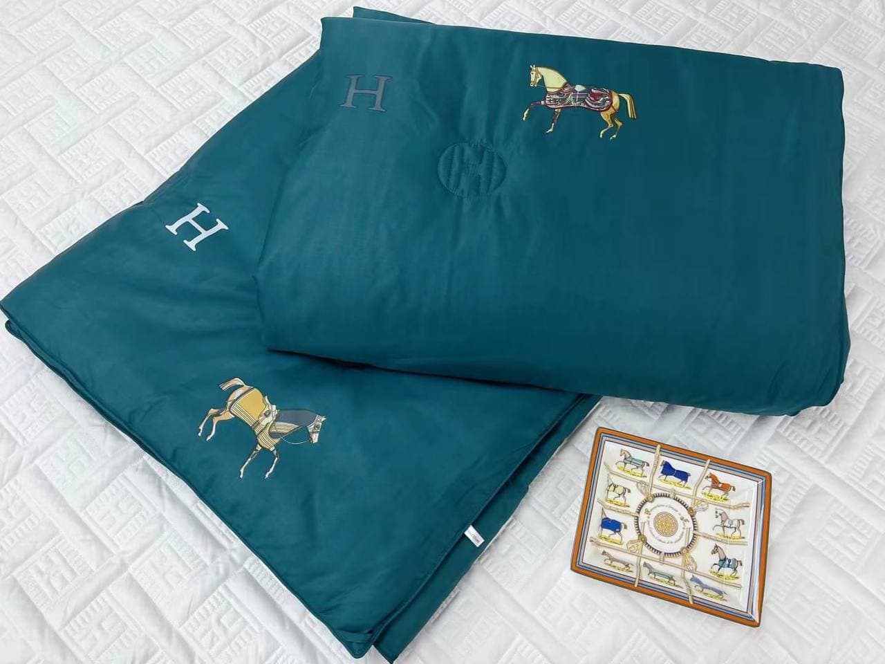 Роскошное одеяло Hermes LUX-60244, выполненное в глубоком зеленом цвете, украшено элегантными вышивками в виде лошадей и фирменным логотипом бренда. Этот предмет интерьера сочетает в себе высокое качество материалов и изысканный дизайн, характерный для Hermes. Оно идеально подойдет для создания уютной и стильной атмосферы в вашей спальне.
